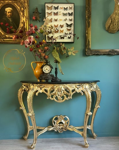 ✨ Exclusieve barokke sidetable – zwart marmer & goldleaf onderstel ✨