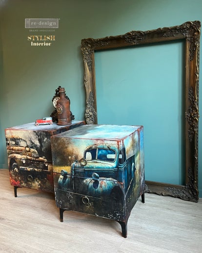 Geef je interieur een exclusieve uitstraling met deze unieke set nachtkastjes, doordrenkt met karakter en verfijnde nostalgie. Ieder kastje is voorzien van een artistieke print van klassieke oldtimers, met een prachtig verweerde afwerking die een Old World charme uitstraalt.