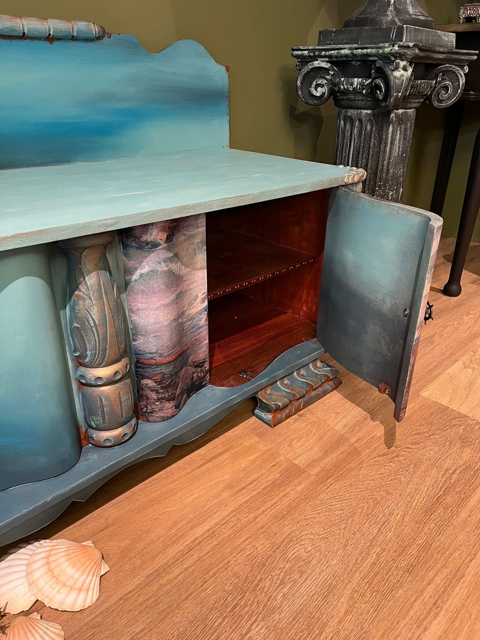 De verschillende kleuren zeeblauw,aquamarijn en turquoise heb ik speels door elkaar geschilderd en op de deurtjes staat een wachtende , mysterieuze zeemansvrouw