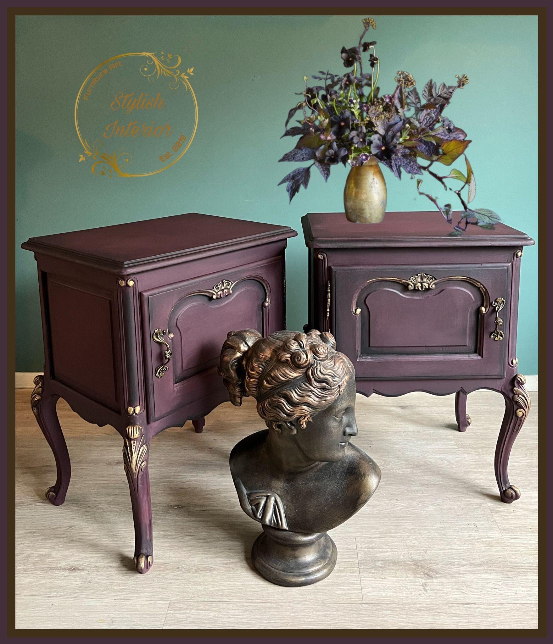 Deze elegante dieppaarse moody dames zijn nadat ze zijn geschilderd afgewerkt met gouden wax op hun prachtige details.Hun paarse kleur loopt over in zwart en geeft ze extra diepte De afmetingen van dit oogstrelende paar zijn B50xH64xD39 cm