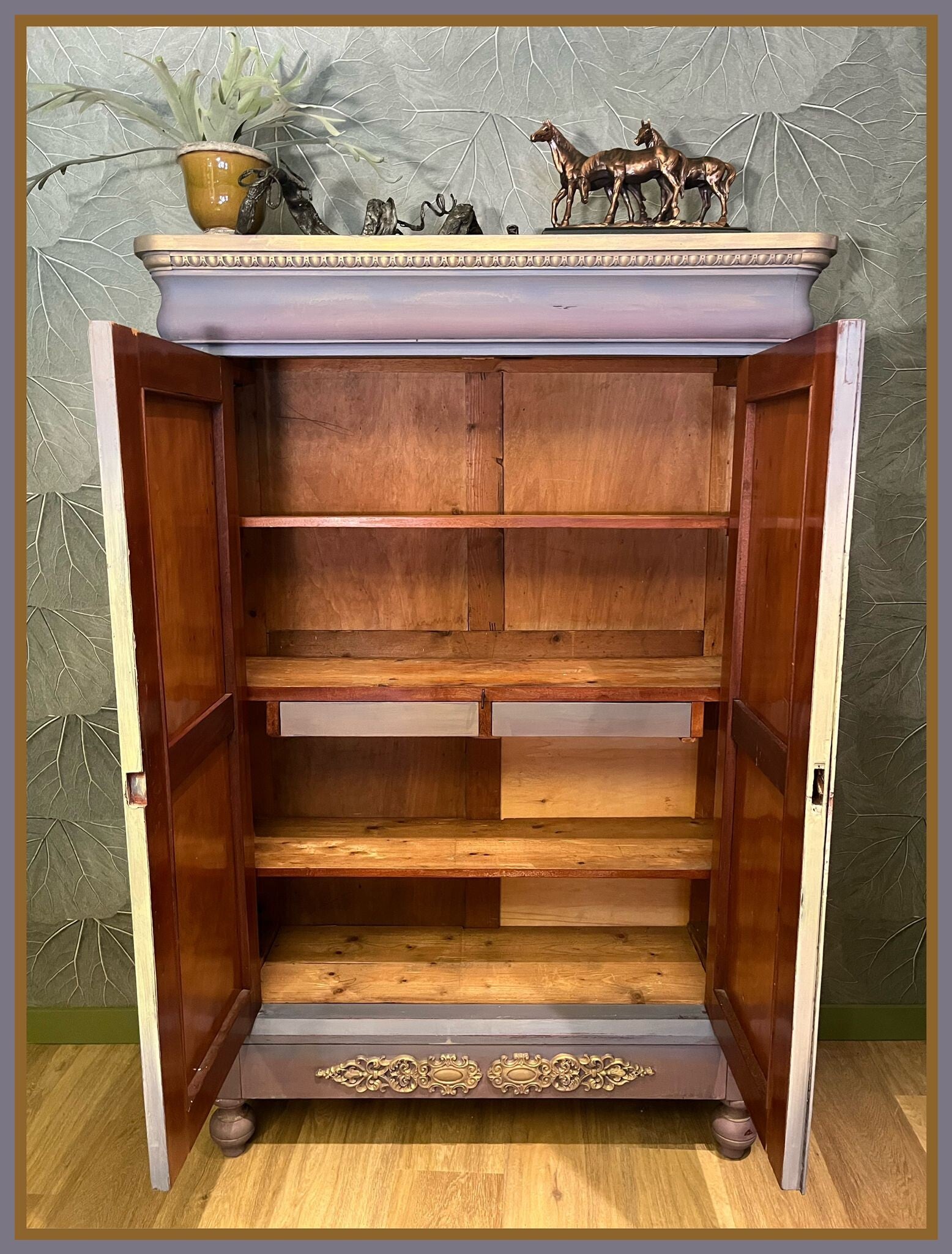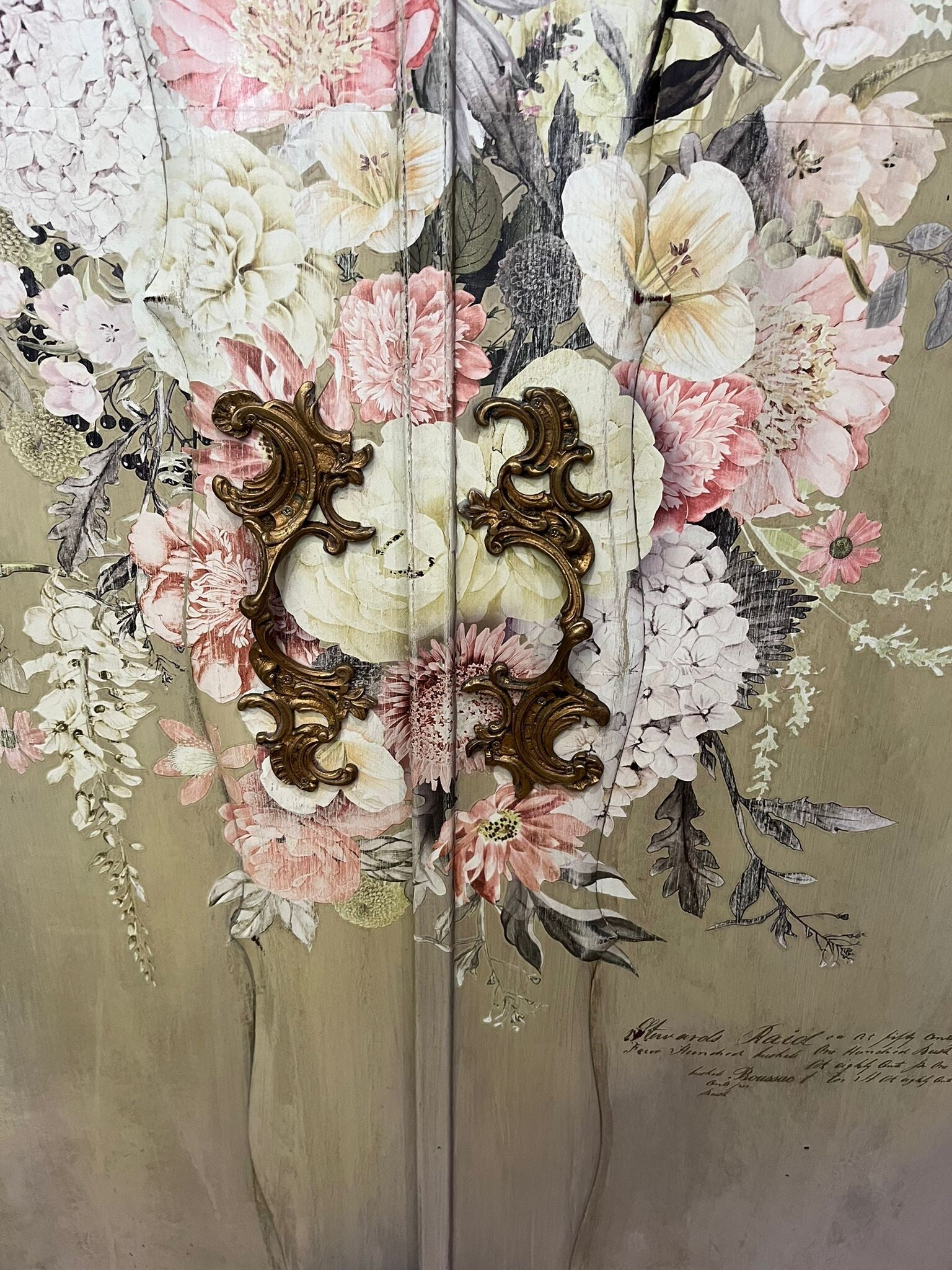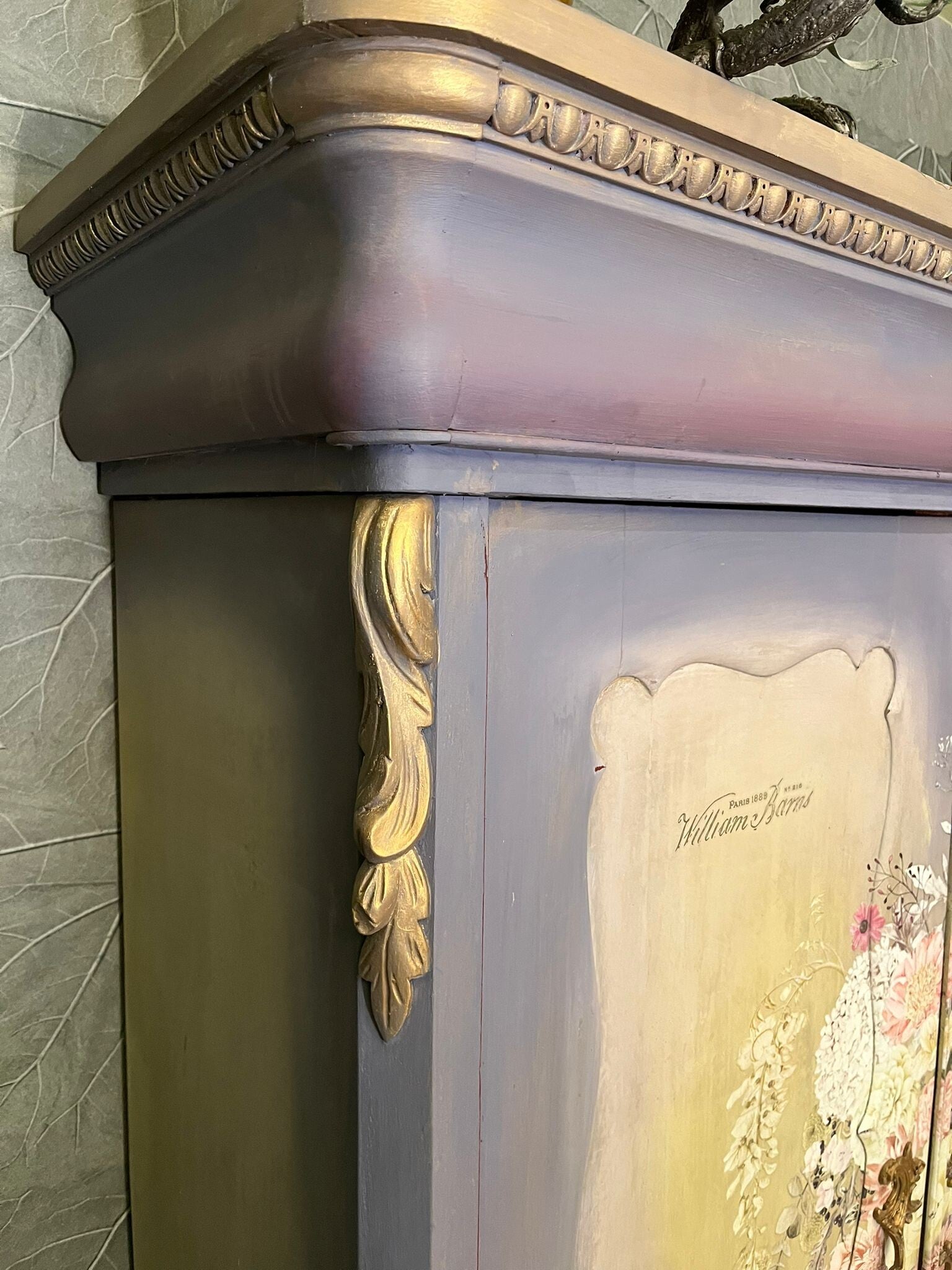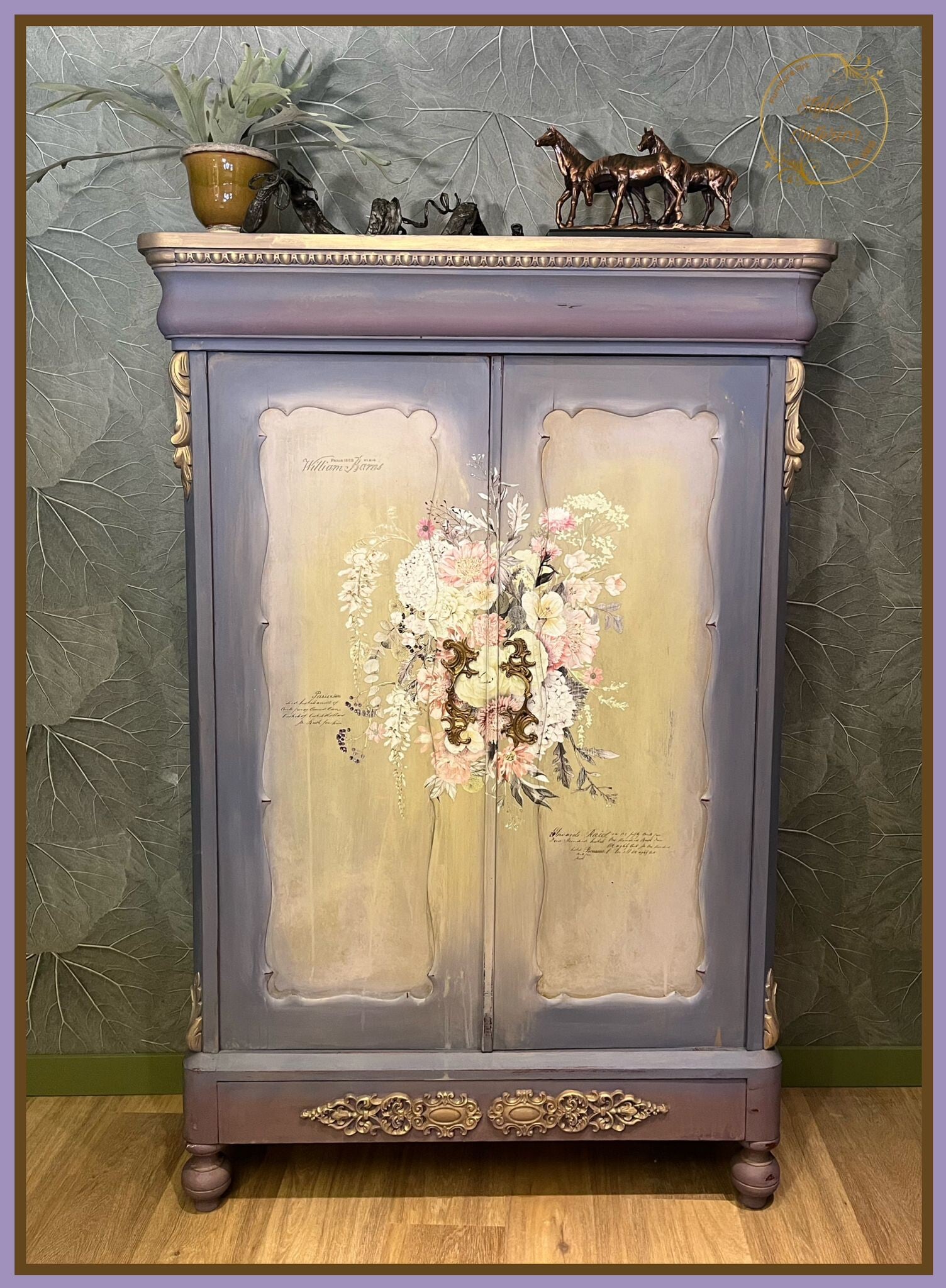 Toen ik deze linnenkast zag wist ik dat ik van haar stuk wilde maken dat tijdloze elegantie uitstraalt en waar je in je slaapkamer bij weg kan dromen! Zacht goud en liefelijke tinten lila en oud wit hebben een verouderende goldwash gekregen met daar overheen licht doorgeschuurde bloemen. Nu lijkt het alsof deze kast met haar mystieke uitstraling uit lang vervlogen tijden de ruimte waarin zij staat een stukje verlicht 🤗