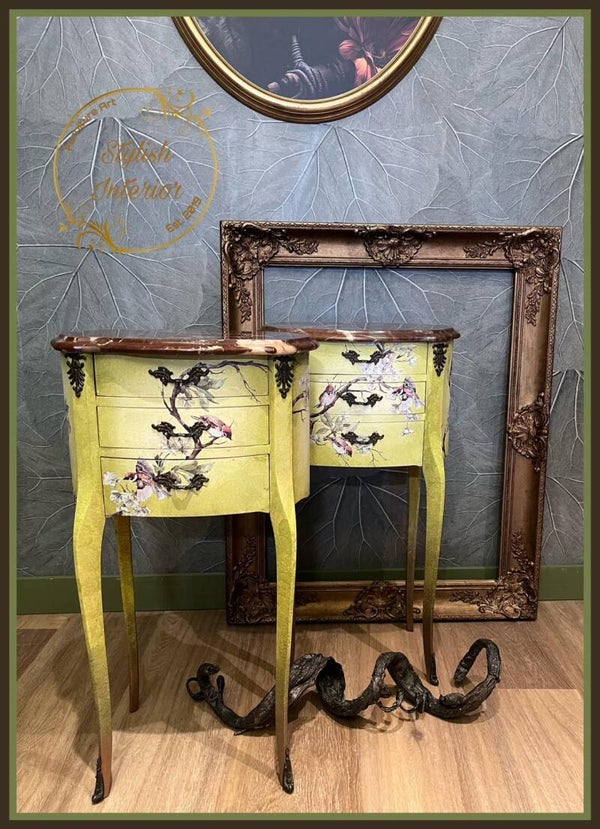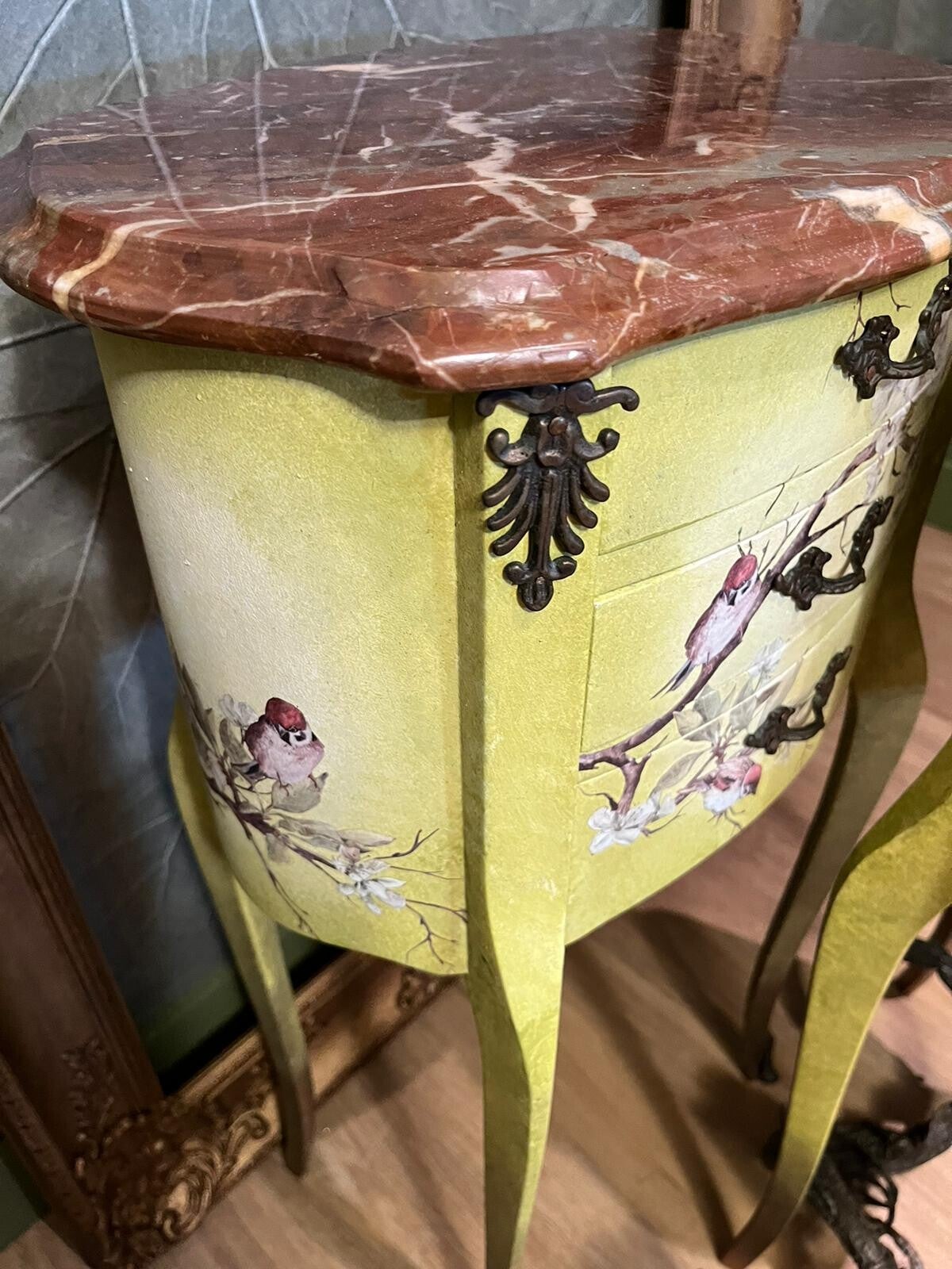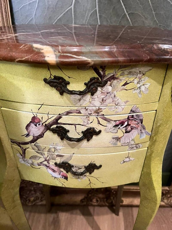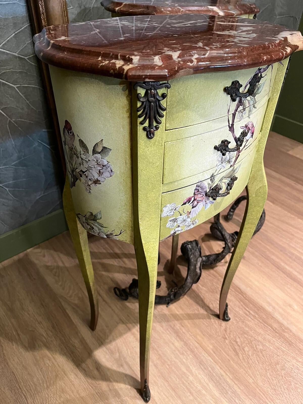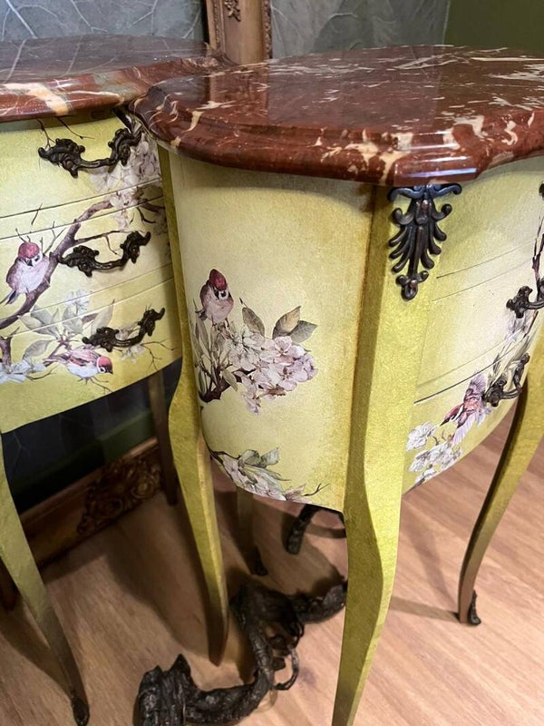 Deze geweldige elegante nachtkastjes zijn geschilderd in verschillende tinten groen en wit en lopen uit naar koper waardoor ze goed bij de bruin marmeren bovenbladen passen.