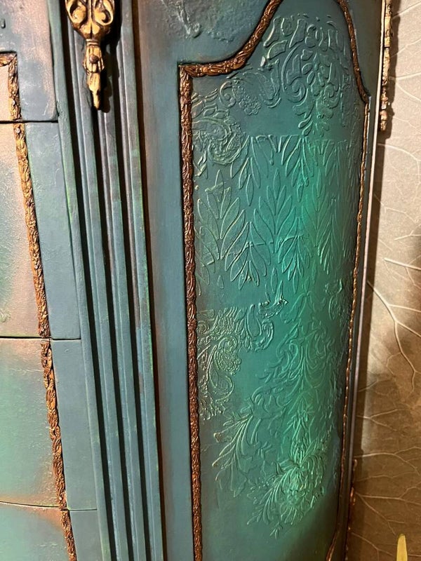 Zelfs Koninklijke Ladekast zou te gewoon zijn om dit elegante antieke pronkstuk dat je terugbrengt naar de tijd van Marie Antoinette te omschrijven. In onze zoektocht naar unieke items zijn we een meubel als dit nog niet eerder tegengekomen . Deze voluptueze dame was al rijkelijk voorzien van bronzen ornamenten en heeft ook nog eens de uitstraling van een juweel gekregen met haar kleuren die overlopen van smaragd naar aquamarijn. Ik heb diepte gecreëerd in de zijpanelen waardoor een intrigerend schouwspel ontstaat.en nog wat extra karakter toegevoegd door accenten van kopen en roest. Dit opvallende kunststuk geeft elke ruimte een luxueuze uitstraling . Geniet van de weelde en charme van dit koninklijke juweeltje, en maak je huis echt buitengewoon.