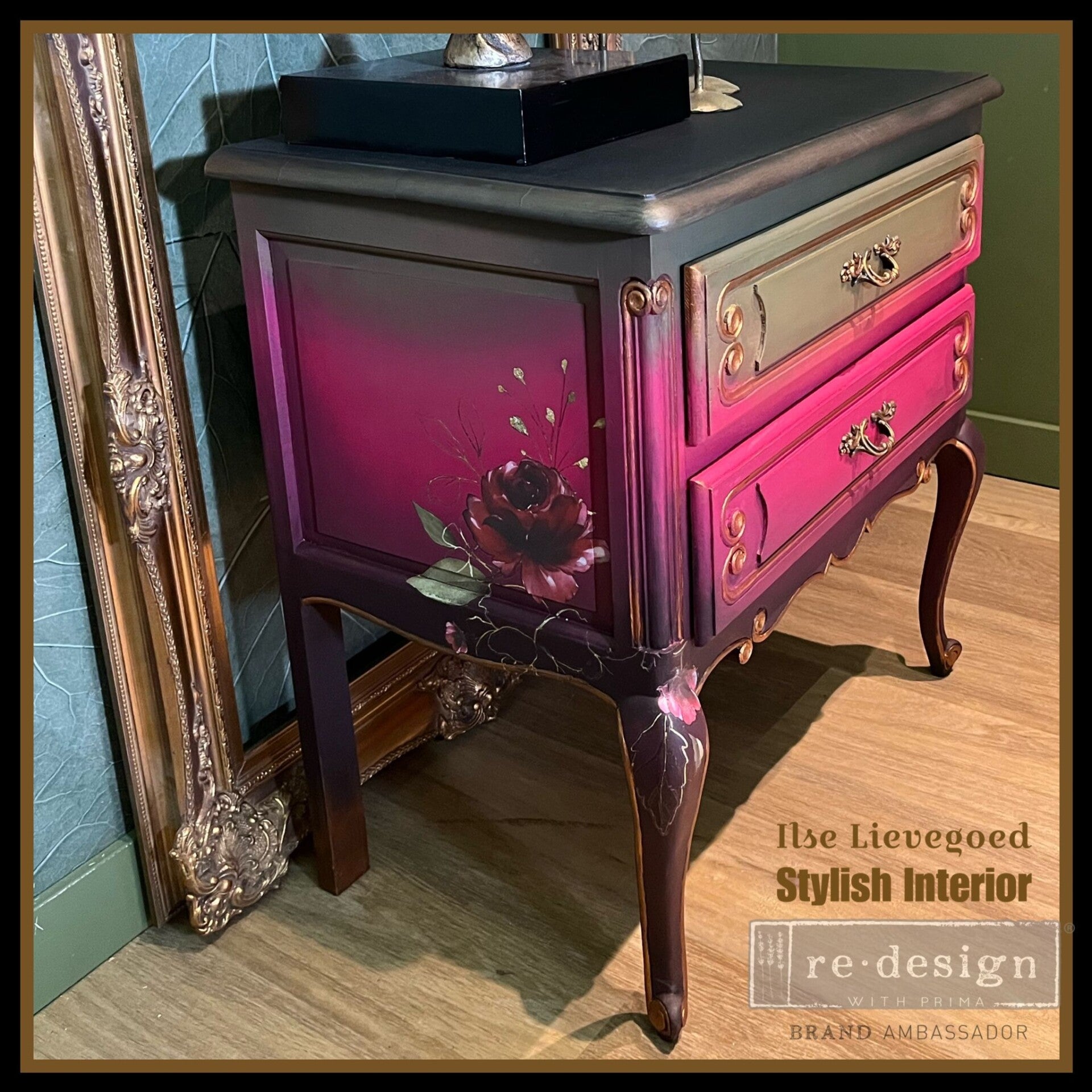 Deze warm gekleurde ladekast loopt net zoals de zonsondergang van warm geel naar purperrood en bijna zwart. De donkerrode bloemen en vleugjes goud maken haar helemaal compleet.