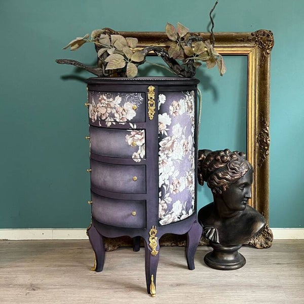 Sprookjesachtig en geheimzinnig, dat is deze ronde romantische ladekast met haar elegante bloemen.