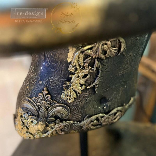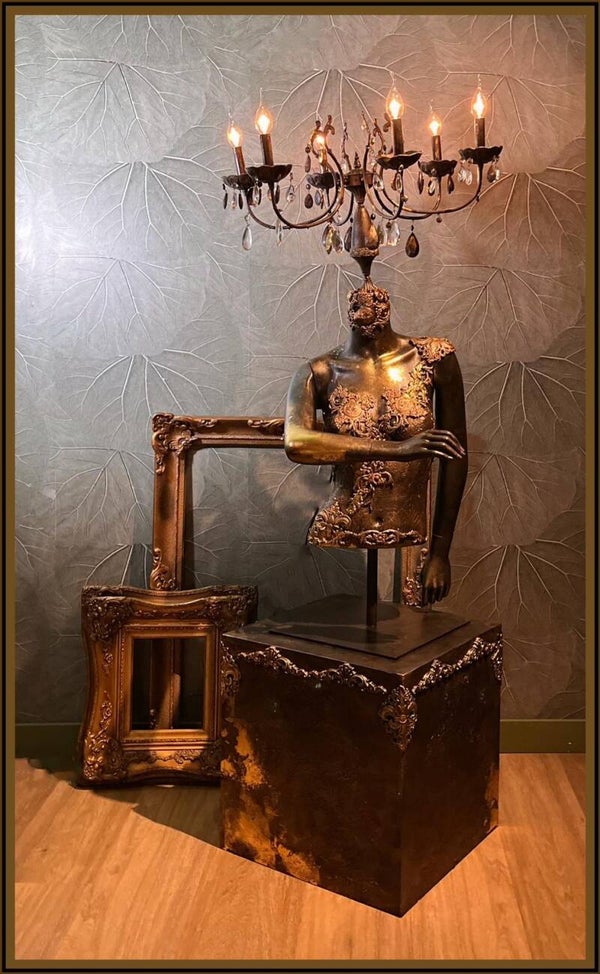 Deze mannequin belichaamt eigenlijk de ideale vrouwelijkheid en de perfectie van lichamen, ze confronteert ons met onze eigen menselijke conditie. Vaak zijn ook mannequins slachtoffer van de verwoestingen van de tijd, worden ze uiteindelijk in de steek gelaten, versnipperd, gefragmenteerd, verminkt en gezichtsloos. Door te werken met Patina’s, lijstwerk, vergulding, collages van bladgoud,ornamenten en wax heb ik deze mannequin als een canvas bewerkt zodat ze een waar kunstwerk wordt en een nieuw verhaal vertelt net zoals juist de imperfecties in mensen vaak interessant zijn en een verhaal vertellen.