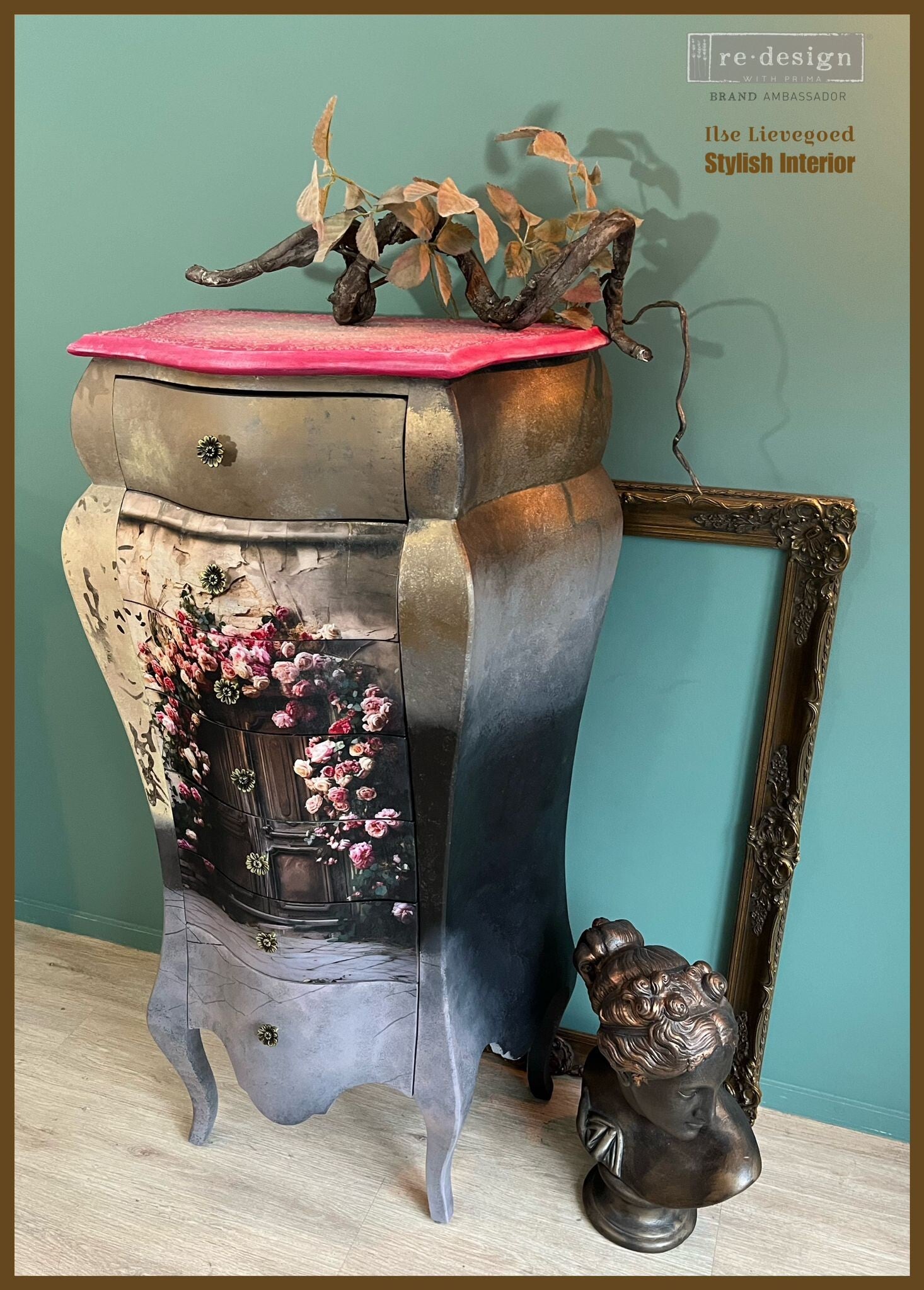 De mysterieuze deur met prachtige rozen achter een geheime muur maakt je nieuwsgierig naar wat erachter verborgen ligt en de top is bewerkt met sierlijke patronen die gevormd zijn door kleine glaspareltjes en geven haar daardoor een luxueuze uitstraling.