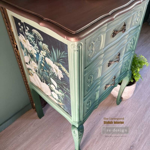 Elk interieur krijgt warmte en leven door een beetje natuur en groen . Deze prachtige elegante ladekast past met zijn kleuren overlopend van eucalyptus naar toermalijn groen en botanische print perfect in bijna elk interieur en is perfect geschikt voor deze taak! De top is van verouderd brons en geeft een rustieke uitstraling en neutrale uitstraling.
