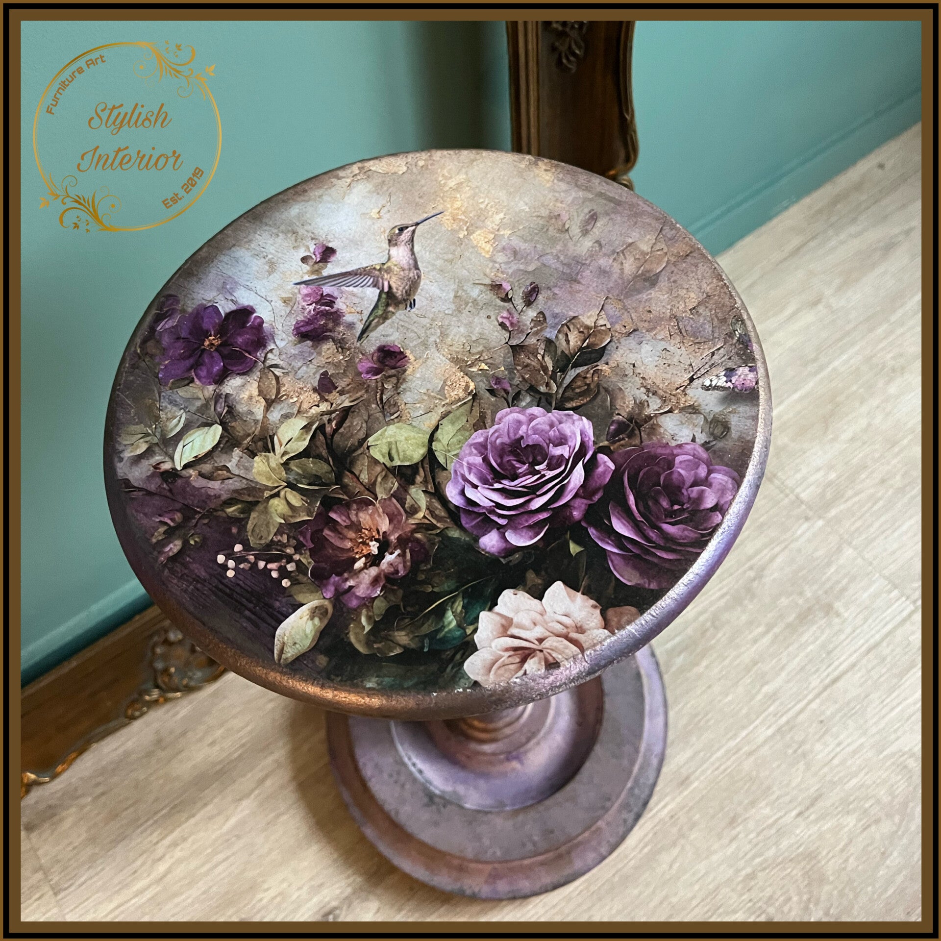 Dit elegante bijzettafeltje is voorzien van een kolibrie en romantische bloemen en zijn geschilderd in verschillende tinten lila met een vleugje koper en grijs.
