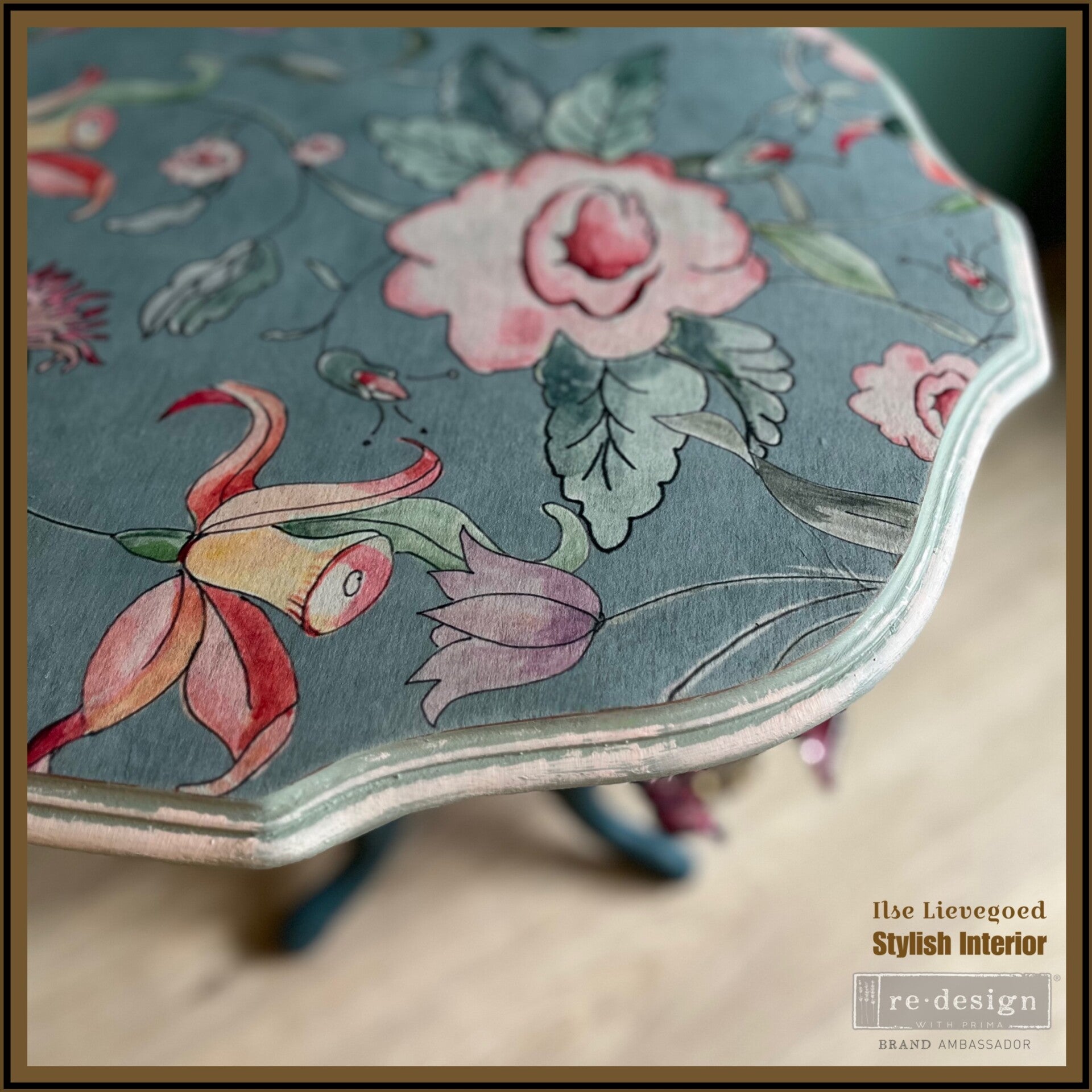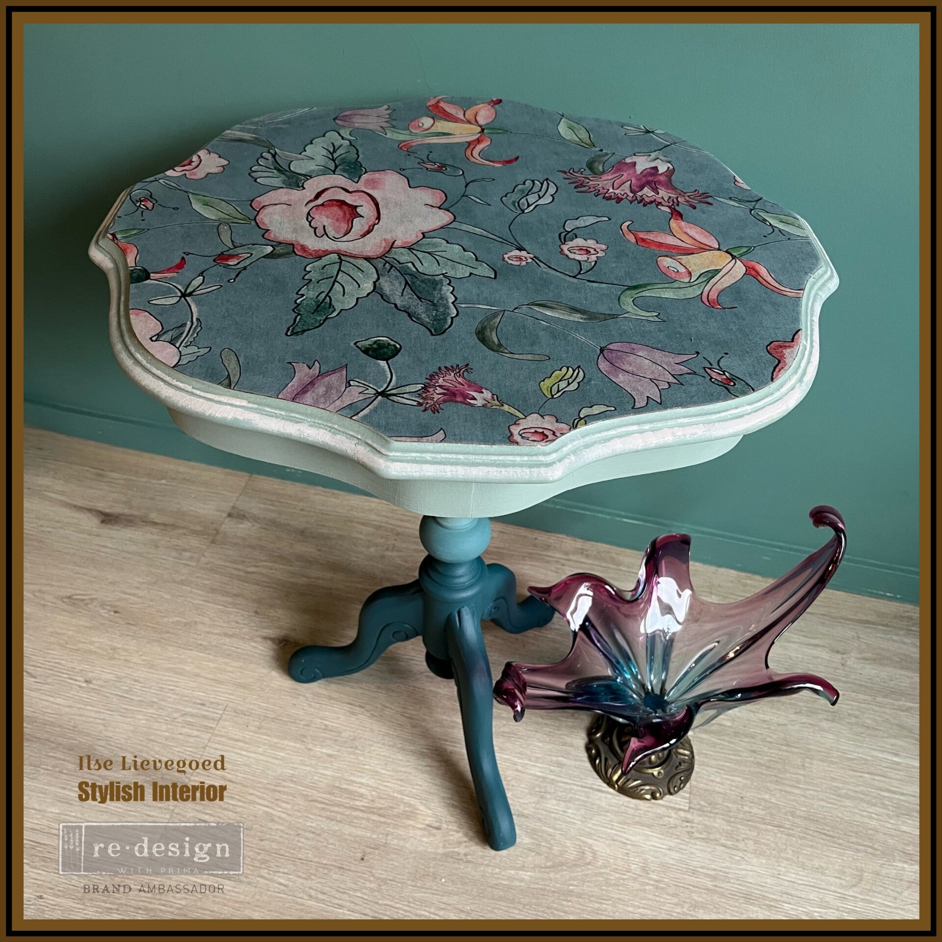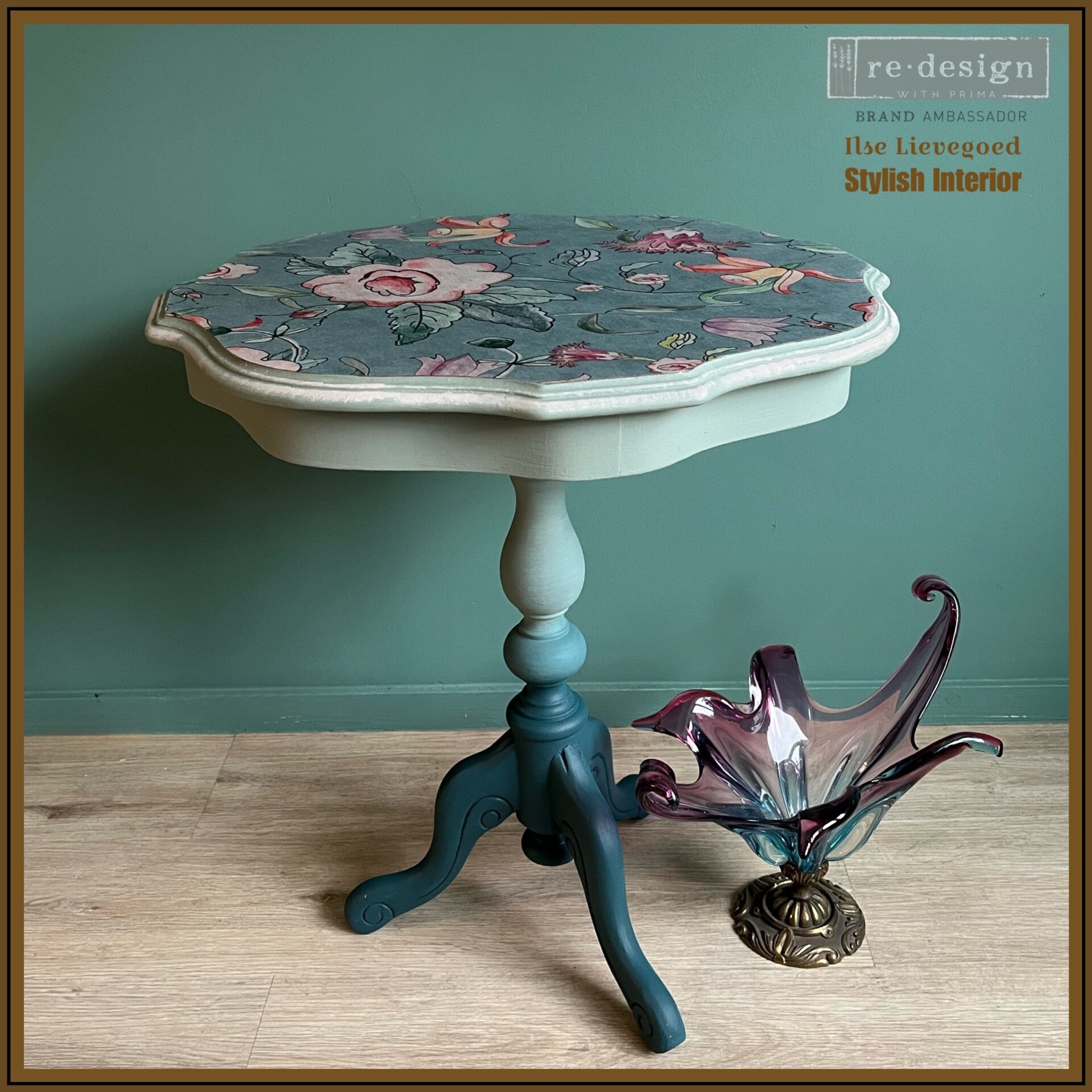 Dit nostalgische bijzettafeltje is geschilderd in vergrijsd blauw en loopt over naar diep donkerblauw. De vintage print op het blad is een perfect match!