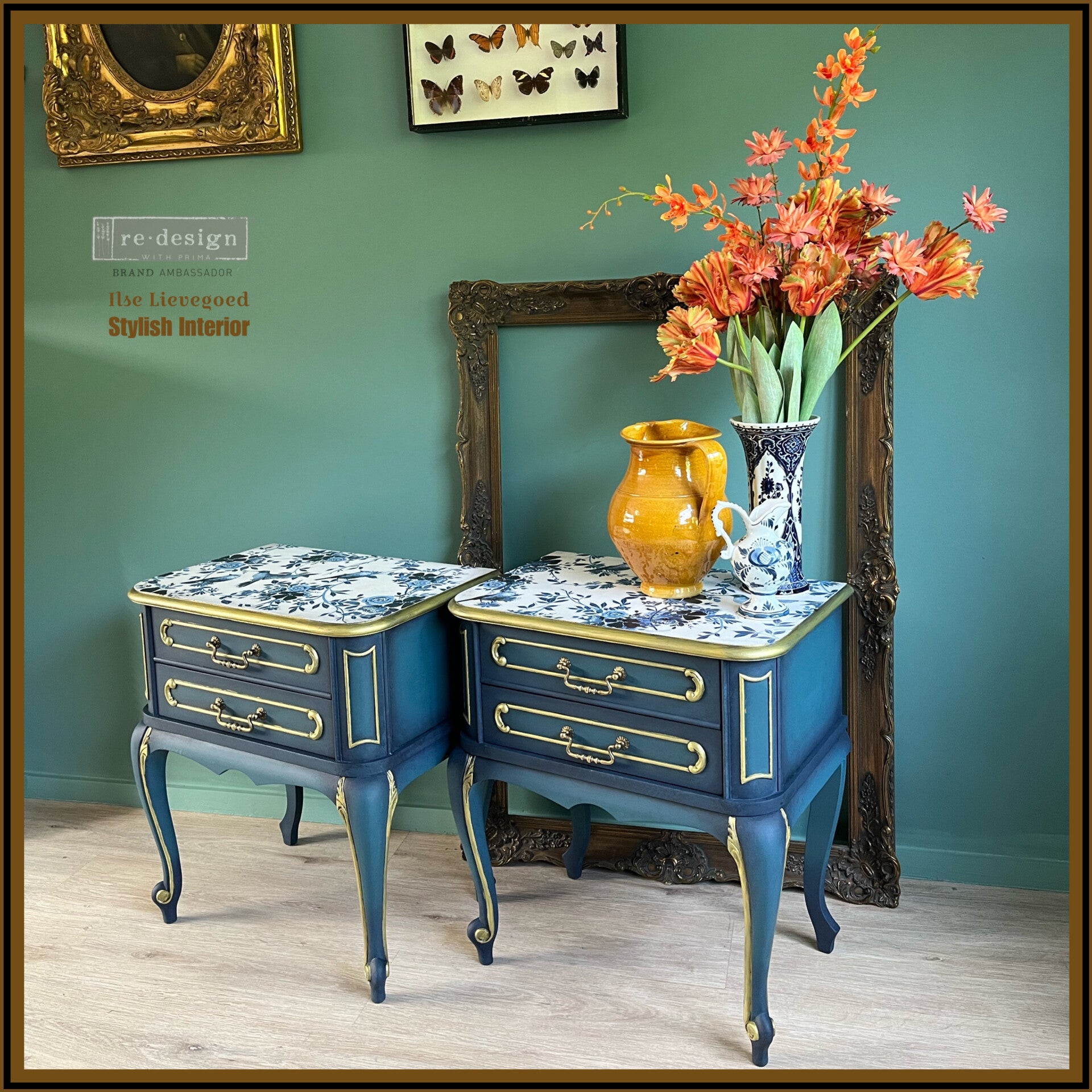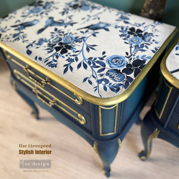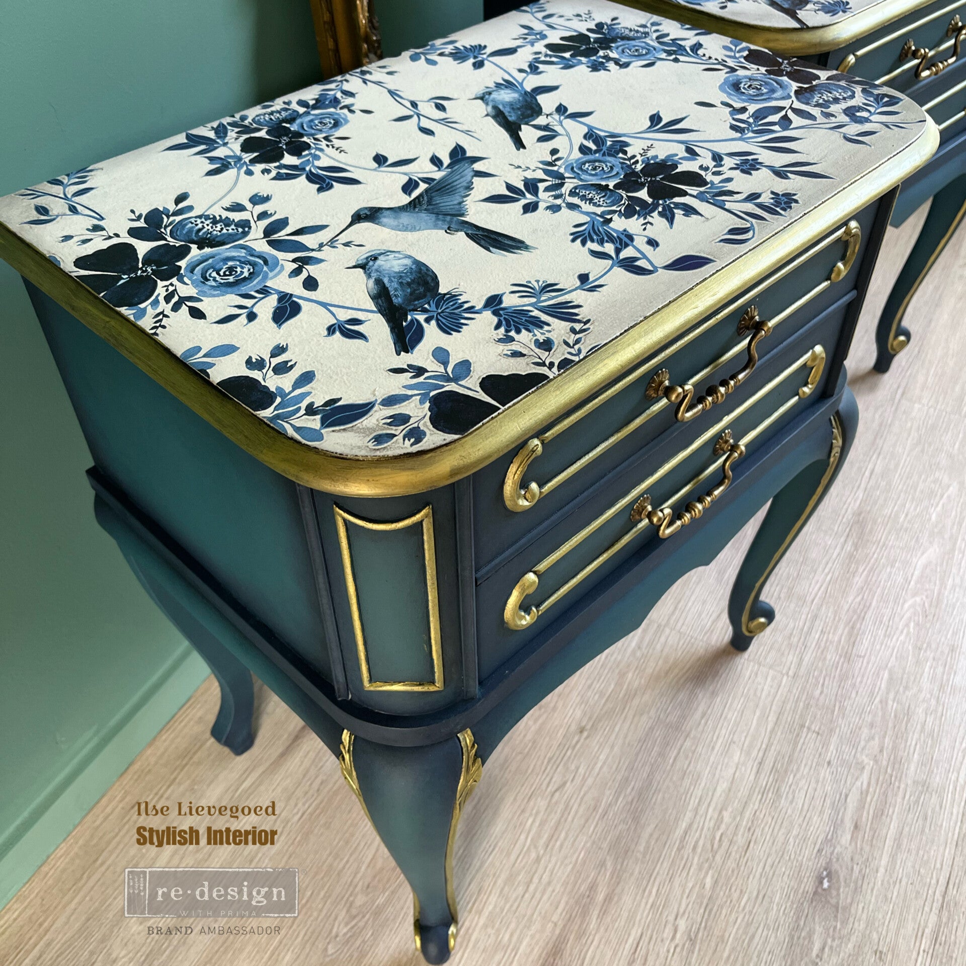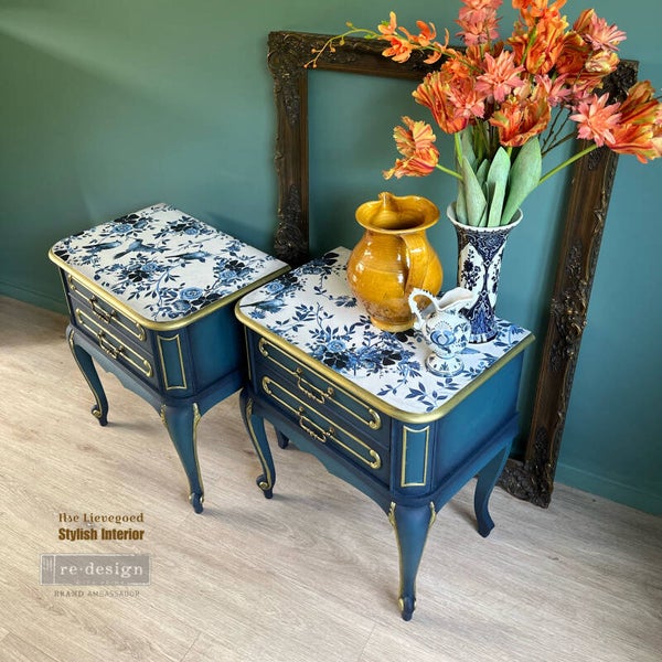 Met deze set nachtkastjes tover je elke slaapkamer om tot een waar paradijs! De kleuren van deze kasten lopen over van vergrijsd blauw naar diep donkerblauw en de boven bladen zijn voorzien van allerlei vogels en bloemen in dezelfde tinten. De gouden details en zwarte wax maken dit setje helemaal af.