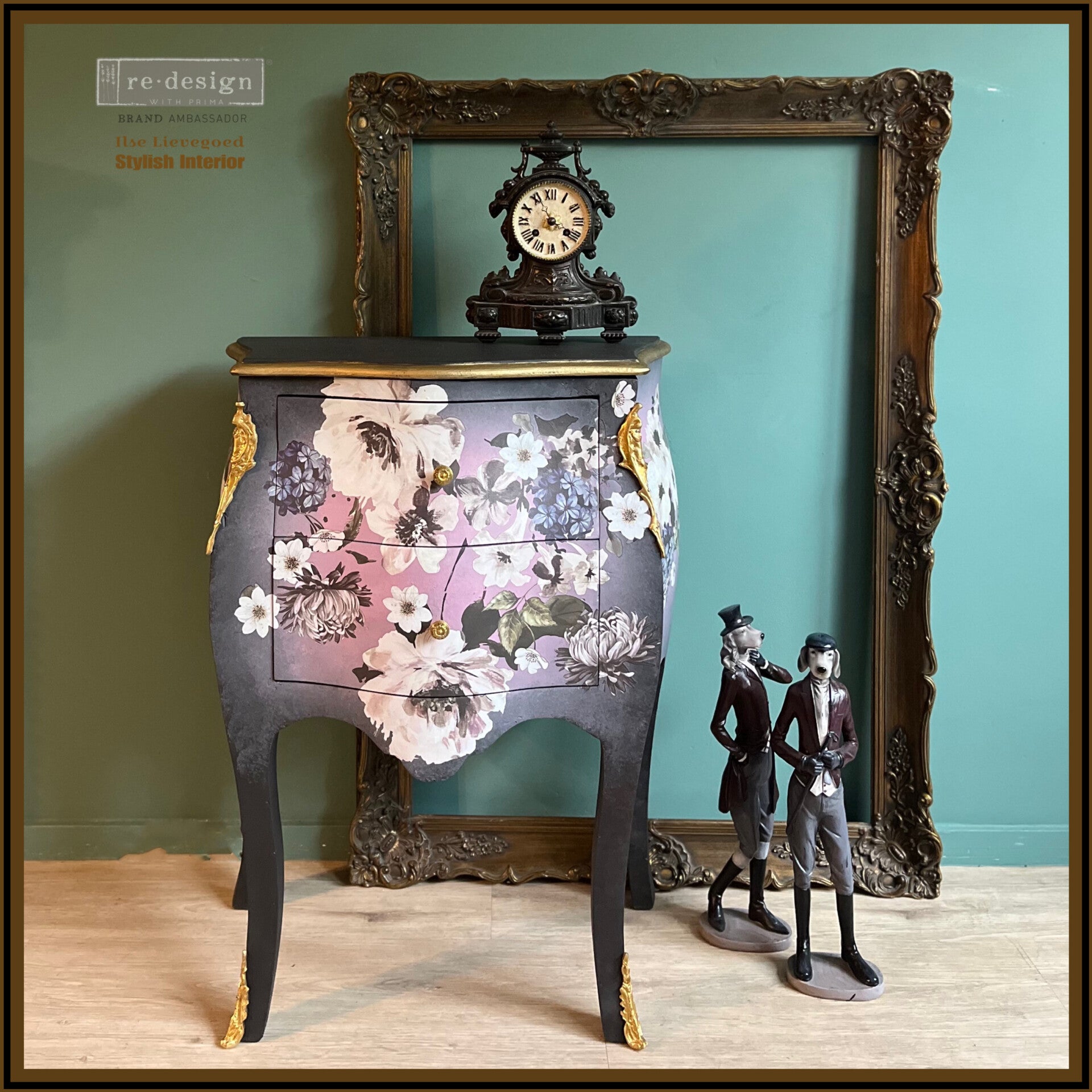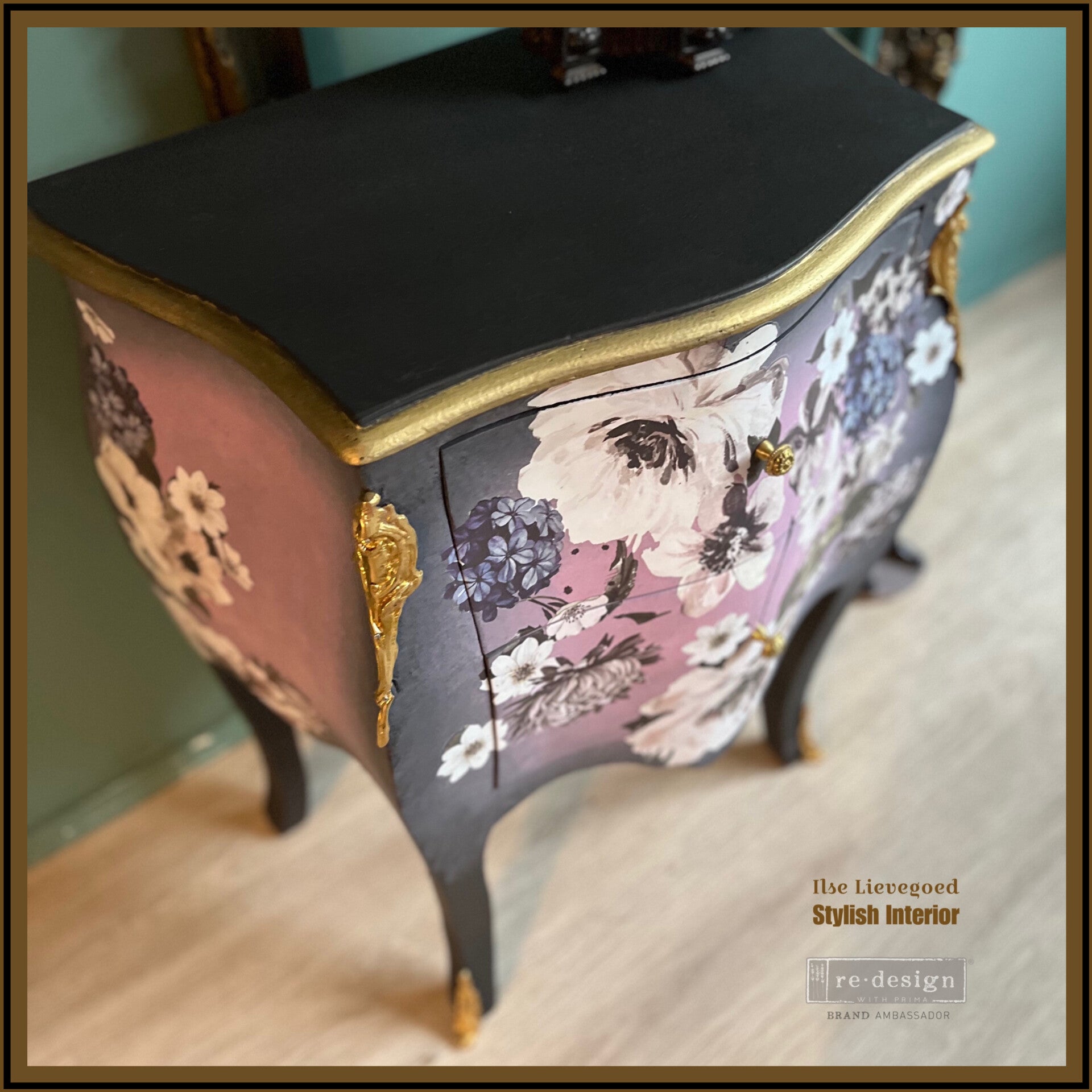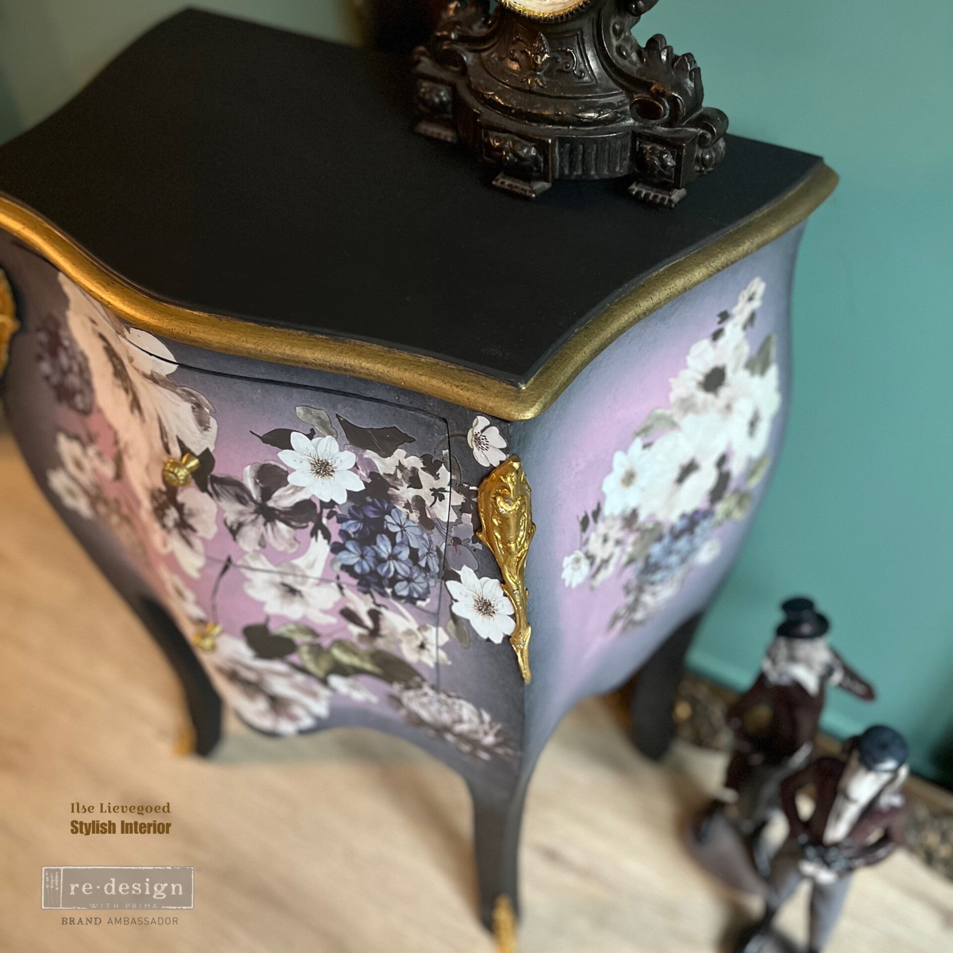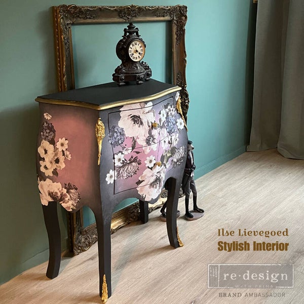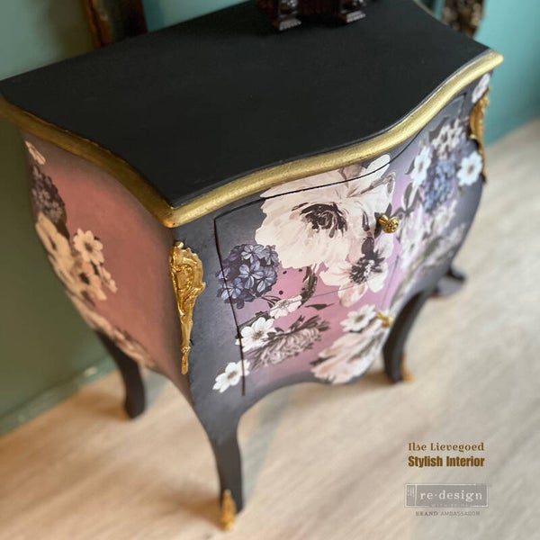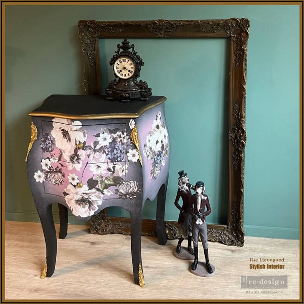 Deze kleine bombe ladekast is geschilderd in lila met tinten roze en grijs. Samen met de bloemen vormt het een prachtig geheel en waan je je in een Engelse theetuin. de afmetingen van deze flowerbombe zijn