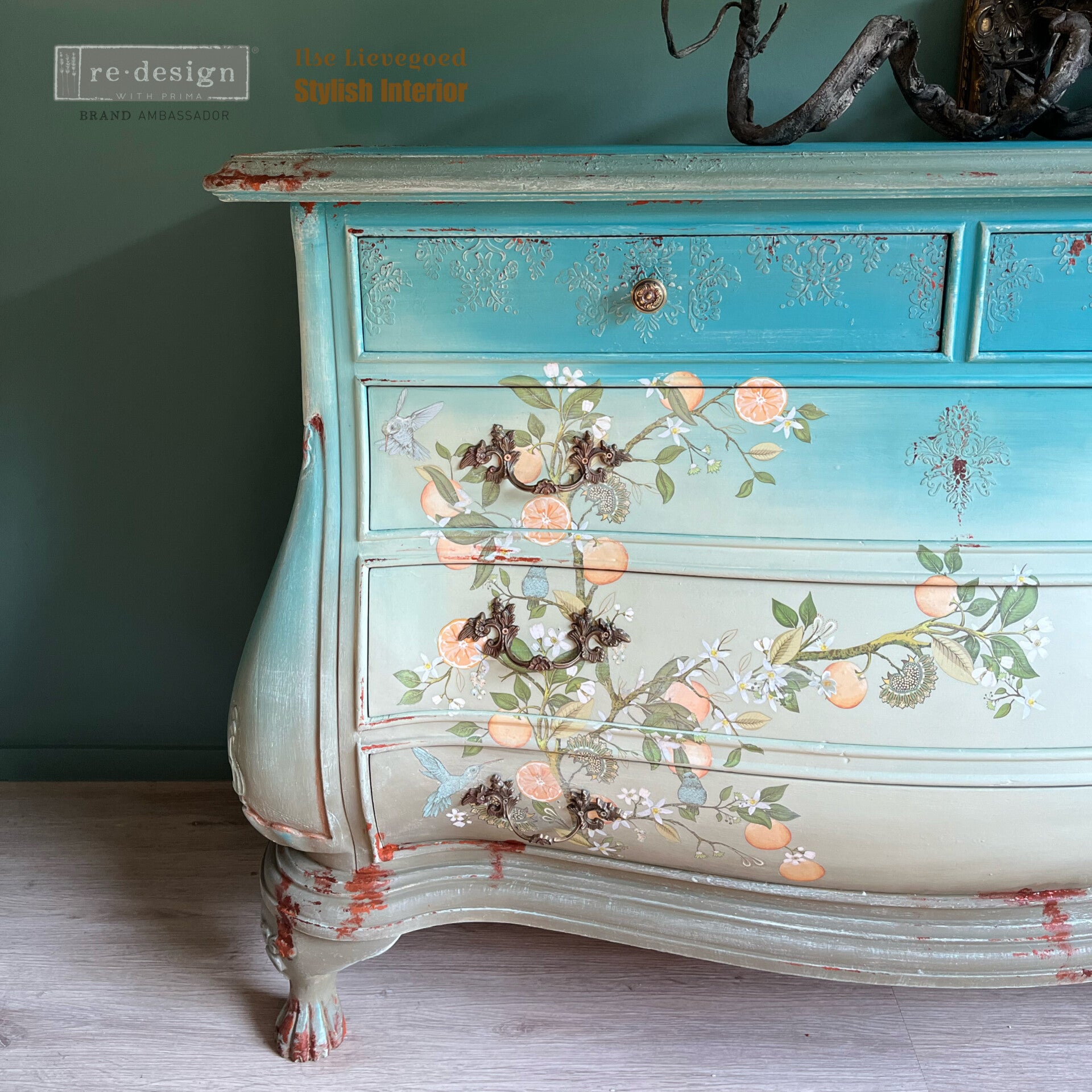 Met deze welgevormde van azuurblauw naar olijfgroen uitlopende ladekast waan je je in een finca te midden van een idyllische boomgaard met duizenden citrusbomen onder de Spaanse zon. Haar afmetingen zijn