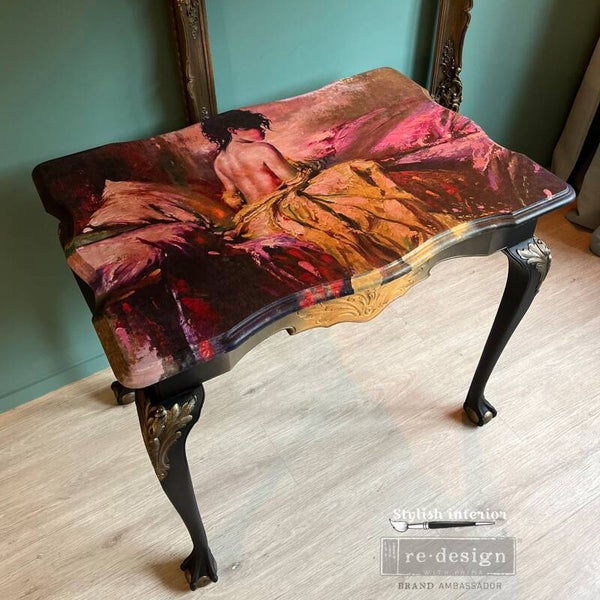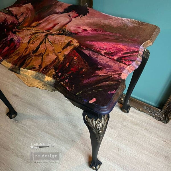 Koper, felle rijke kleuren , sierlijk bewerkt en een prachtige vrouw op de bovenkant van deze glamoureuze tafel maken haar tot een ware eyecatcher.