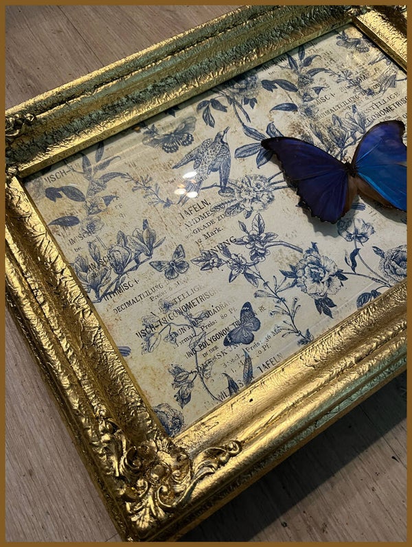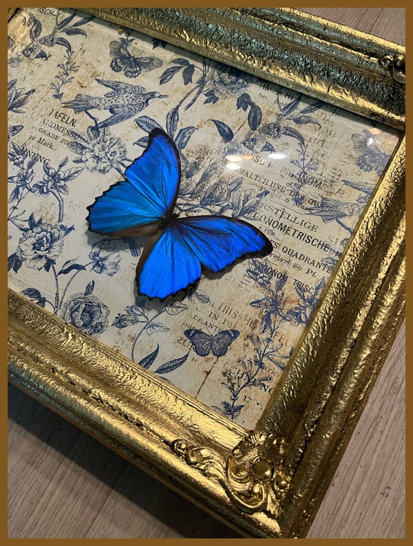 Deze oud gouden vintage lijst heeft een prachtig bol glas waardoor de fluoriserend aquamarijne vlinder (Morpho menelaus)nog mooier uitkomt op zijn retro achtergrond.