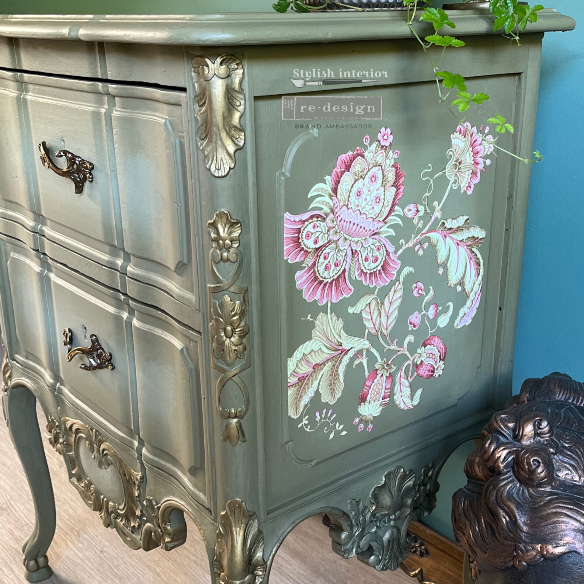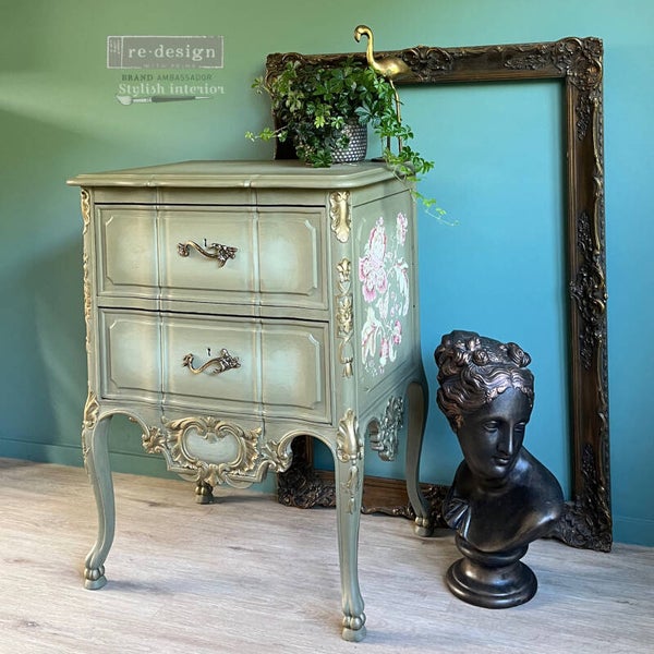 Deze prachtig uitgesneden antieke ladekast is geschilderd in twee kleuren olijfgroen. Ze heeft een glamoureuze, ouderwetse charme met verfijnde barokke details in subtiel goud die eruit springen . De zijkanten hebben frisse Paisley bloemen waardoor antiek moeiteloos samengaat met modern. Deze beauty kan dan ook in vele verschillende interieurstijlen haar weg vinden .