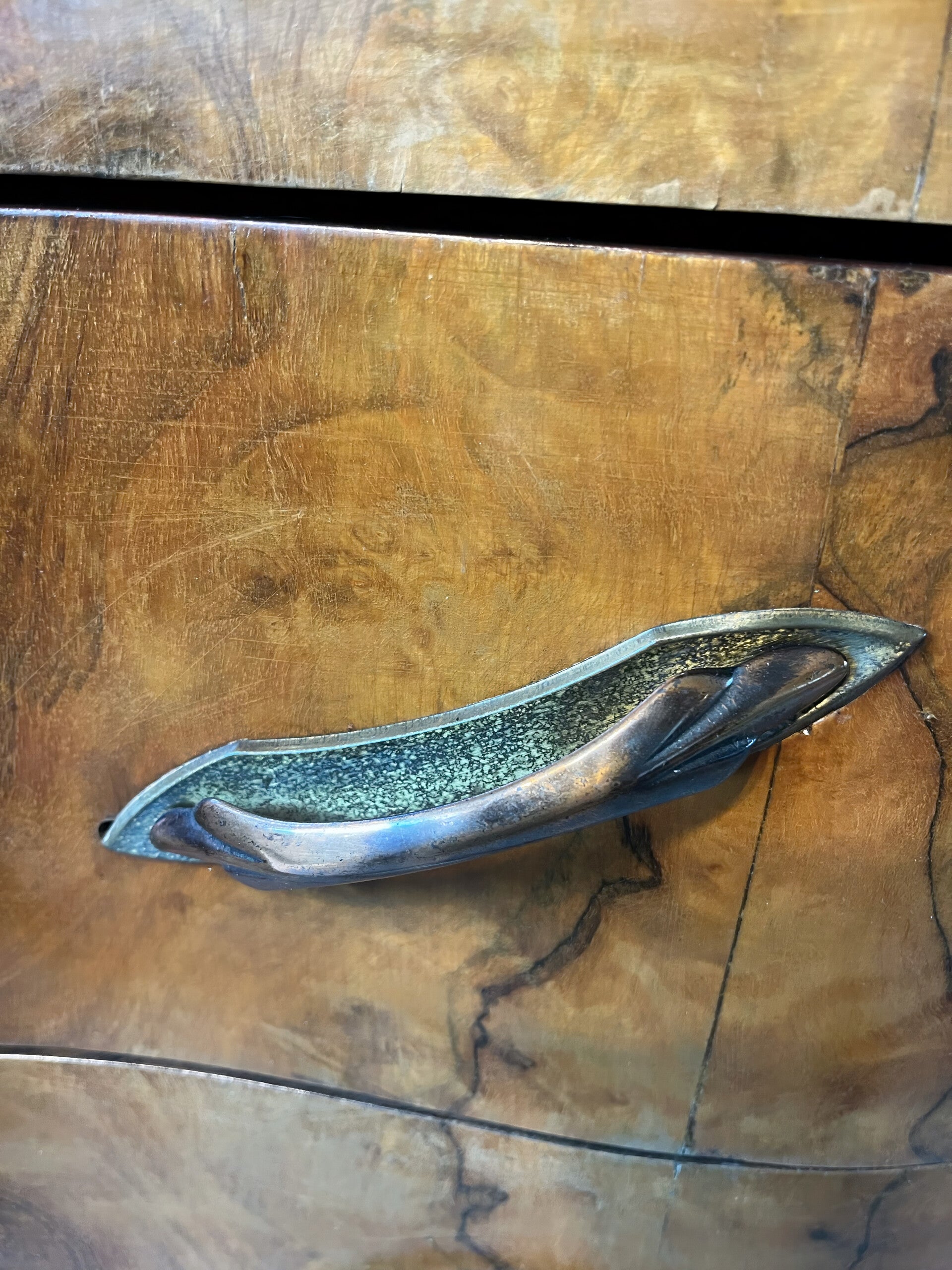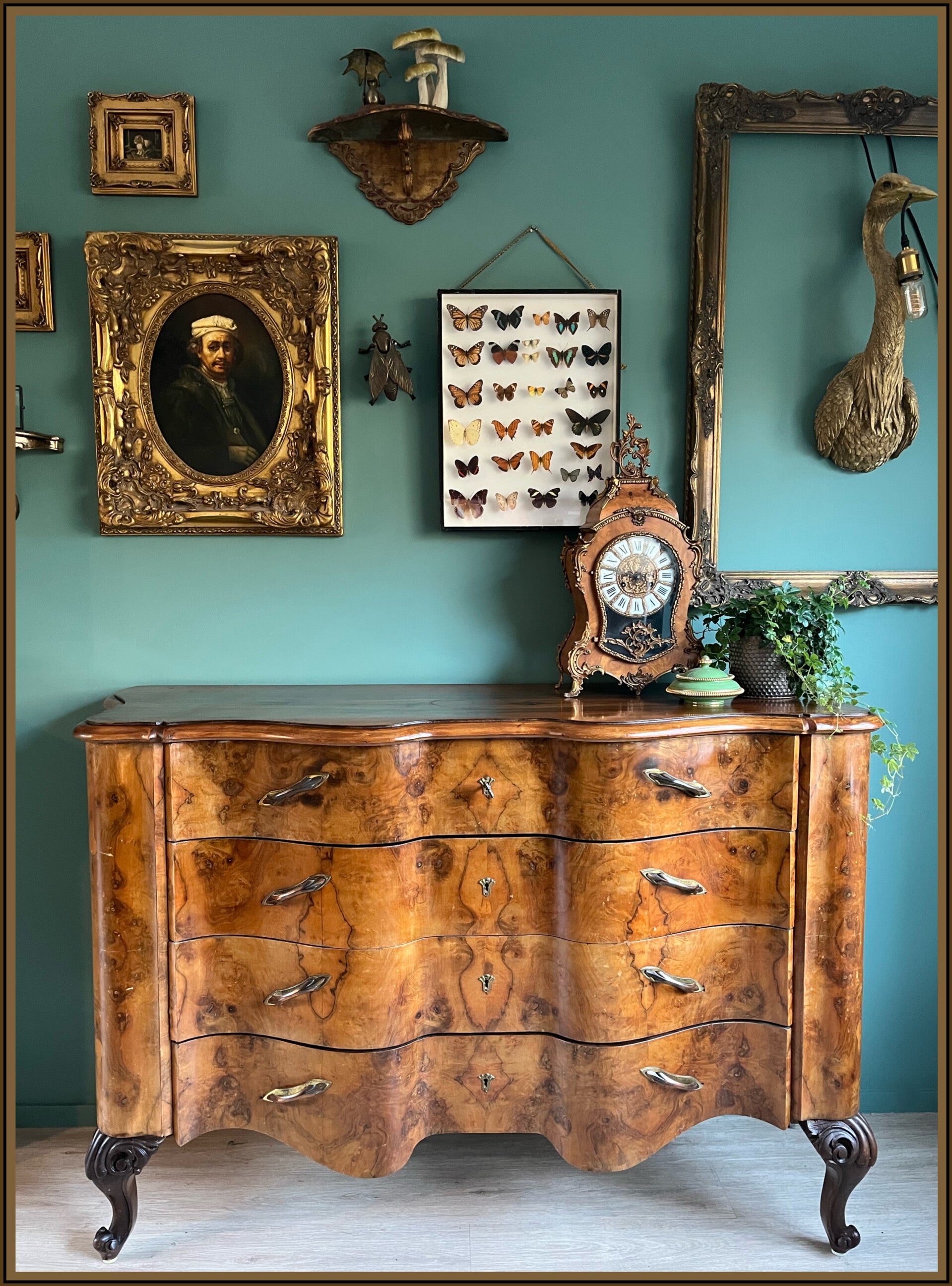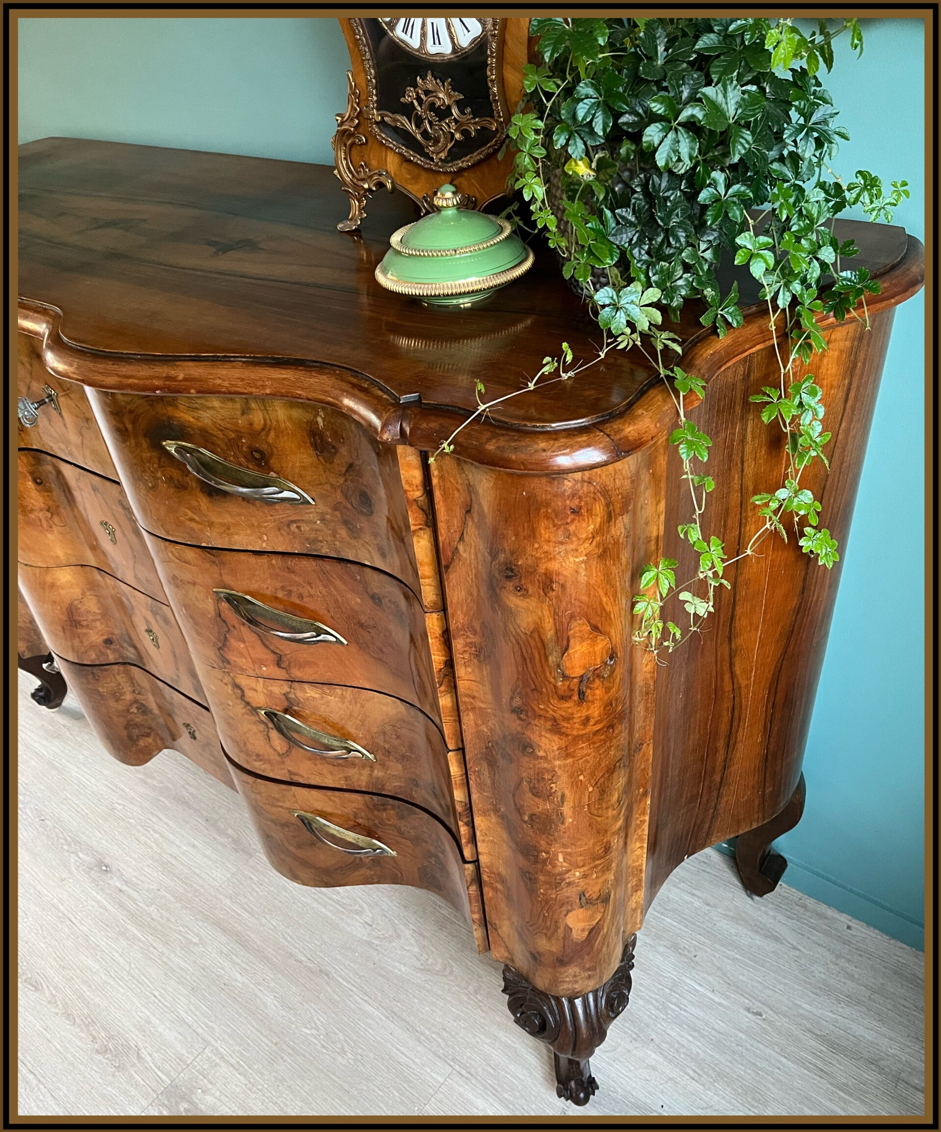 Wat een juweeltje! Deze antieke hele grote ladekast is gemaakt van gefineerd wortelnotenhout, een Europese loofhoutsoort met een fraaie geaderde tekening.De ronde vormen en het prachtige houtsnijwerk maken dit dressoir tot een waar handgemaakt meesterwerk. Het hout heeft een prachtige warme uitstraling en de fraaie messing grepen maken dit antieke dressoir helemaal af. Het dressoir is afkomstig uit Italië.