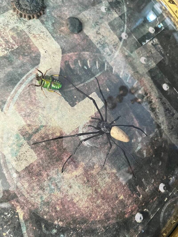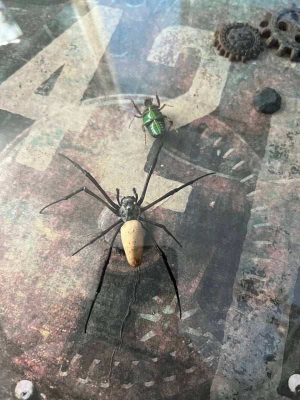 Prachtige ronde bollijst met een steampunk tintje waarin een spin een felgekleurde kever overmeesterd
