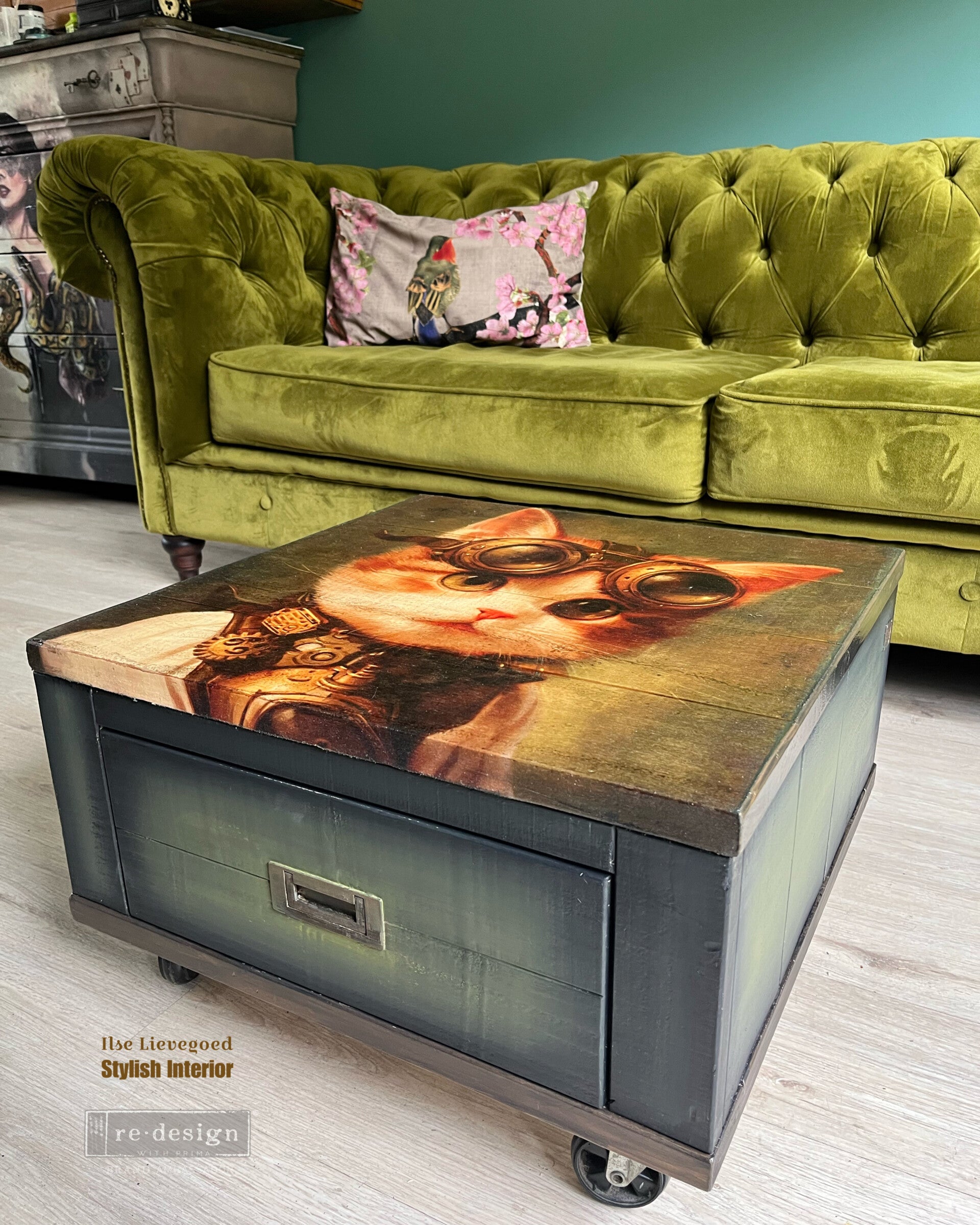 Deze verrijdbare bijzettafel is niet alleen handig doordat er ook een ruime lade in zit maar ook schattig en stoer tegelijk door de prachtige decoupage van een steampunk kat