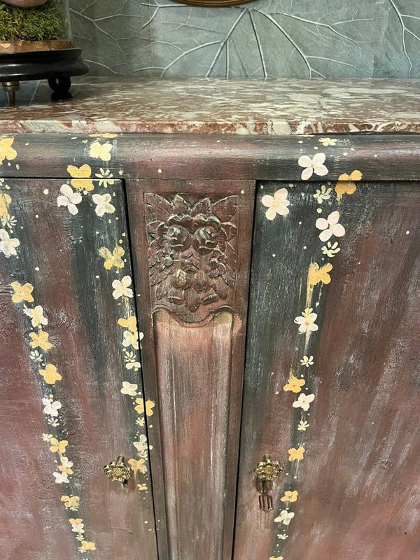 Deze antieke kast is handgeschilderd in verschillende tinten rood en heeft een heerlijke old world finish gekregen met witte wax die door de textuur goed naar voren komt.