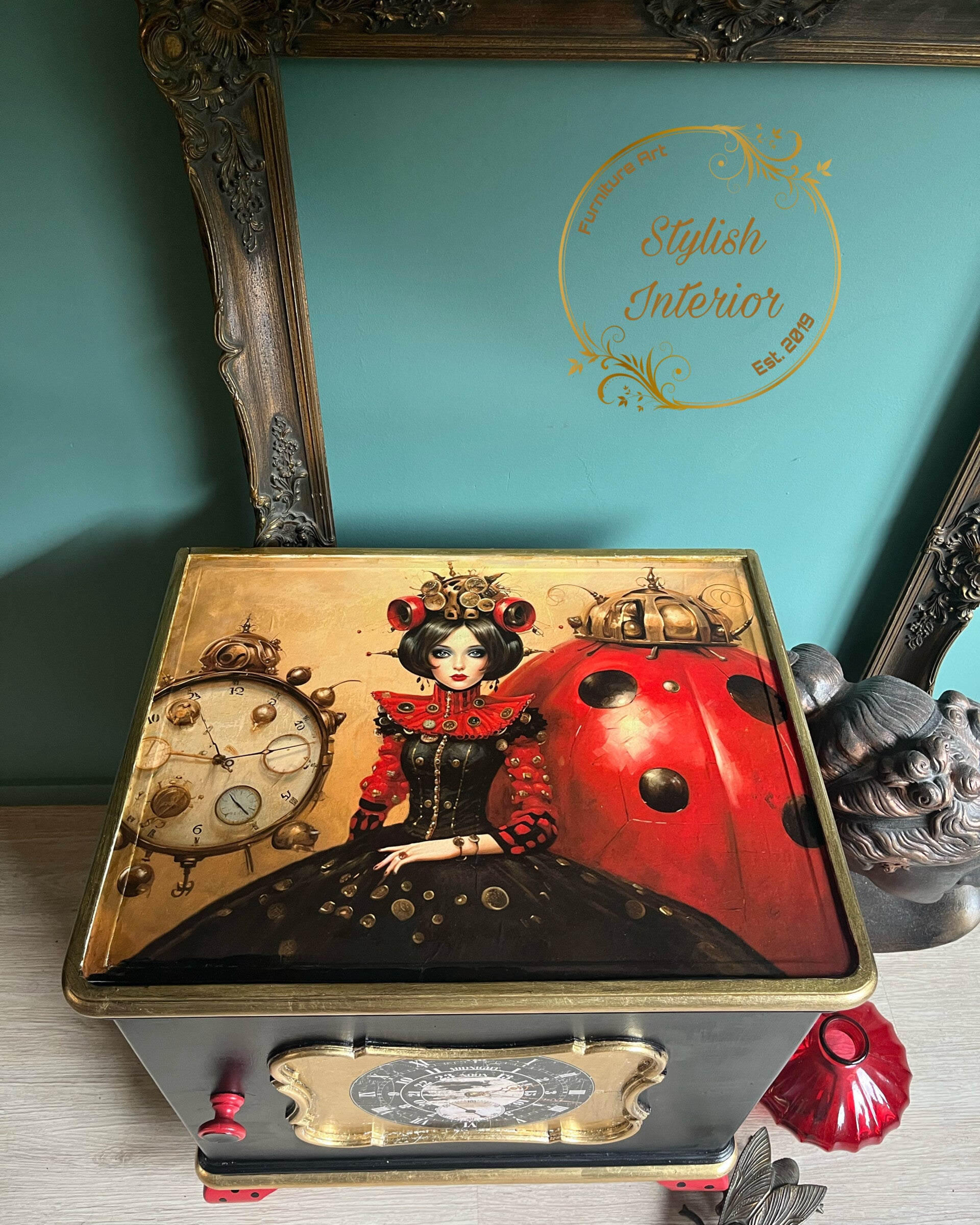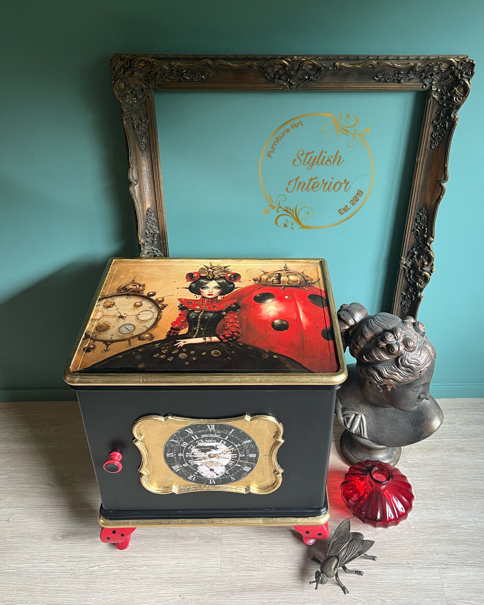 Met haar van warm rood naar diep zwart uitlopende basis en warme, goudrode accenten ademt deze kast luxe en mysterie met een flinke dosis steampunk waardoor ze behalve elegant ook stoer tegelijk is. Het middelpunt? Onze ladybug die met radars en klokken een industriële flair geeft . Het combineert de natuurlijke charme van de natuur met de mechanische ziel van het steampunk-universum.