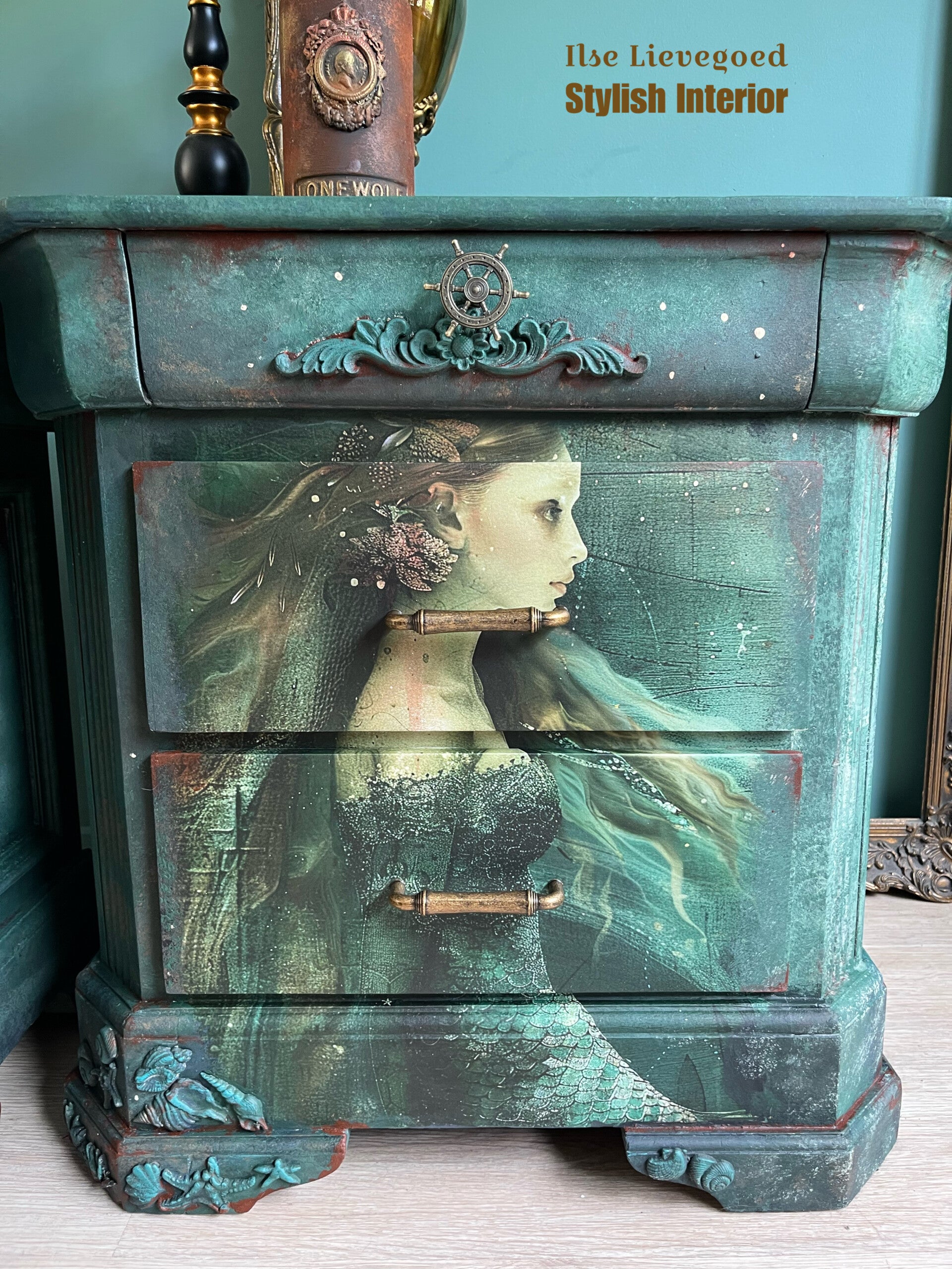 Laat je slaapkamer baden in de magie van de zee met deze exclusieve nachtkastjes in old world stijl. De kastjes combineren een stevige, klassieke vormgeving met roestige schelpen alsof ze al eeuwen op de bodem van de oceaan liggen en de betoverende charme van sirenes. Hun elegante uitstraling maakt ze niet alleen praktisch, maar ook een kunstwerk op zich. Een echte blikvanger voor wie de schoonheid van verhalen en de diepte van de oceaan wil vangen in zijn interieur.
