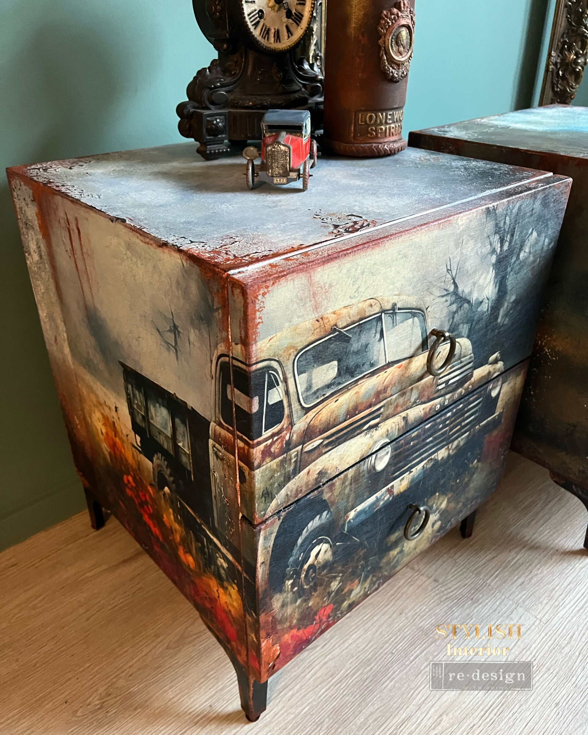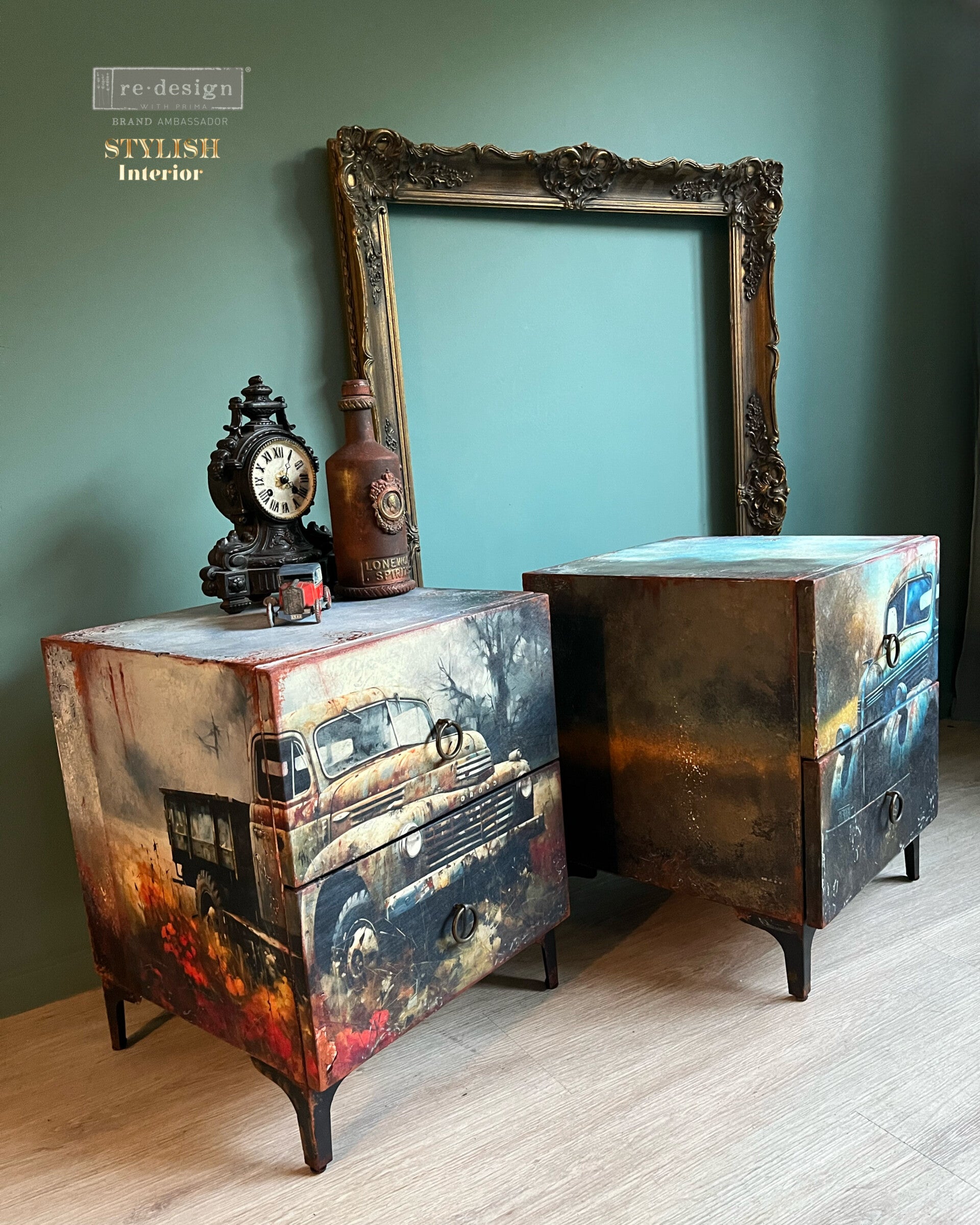 Geef je interieur een exclusieve uitstraling met deze unieke set nachtkastjes, doordrenkt met karakter en verfijnde nostalgie. Ieder kastje is voorzien van een artistieke print van klassieke oldtimers, met een prachtig verweerde afwerking die een Old World charme uitstraalt.