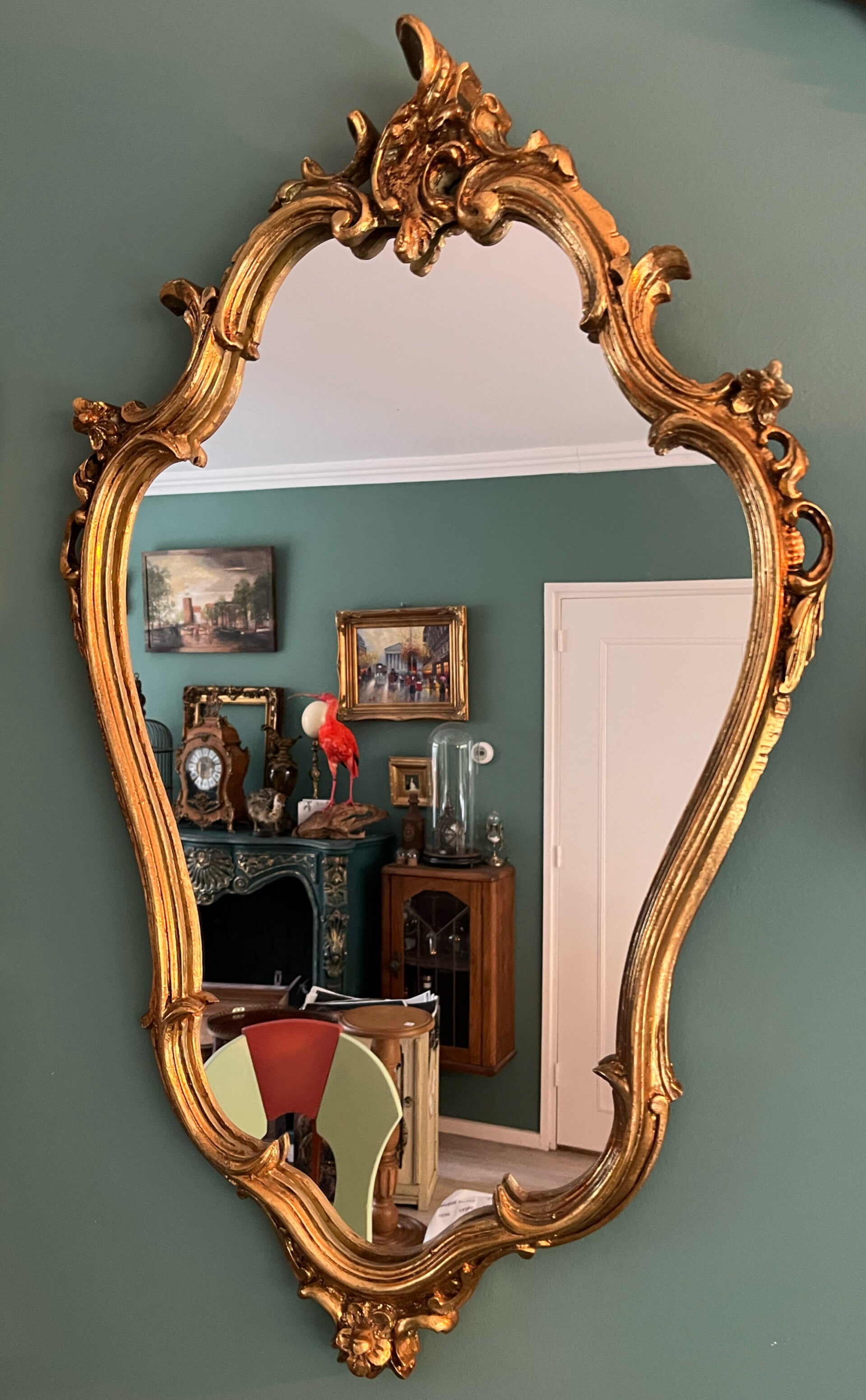 Deze stijlvolle barokke spiegel is een echte blikvanger. De sierlijke lijst, rijk versierd met florale en krulmotieven, is uitgevoerd in een warme goudkleur die elk interieur een vleugje luxe en elegantie geeft.