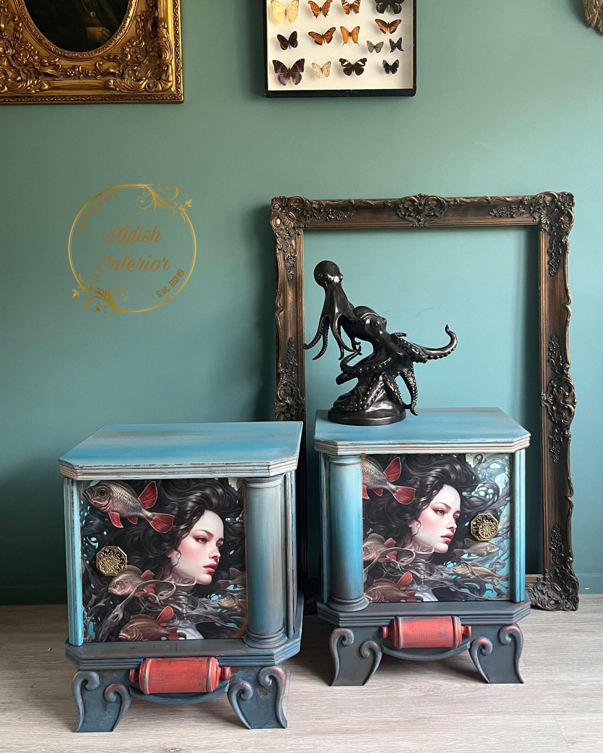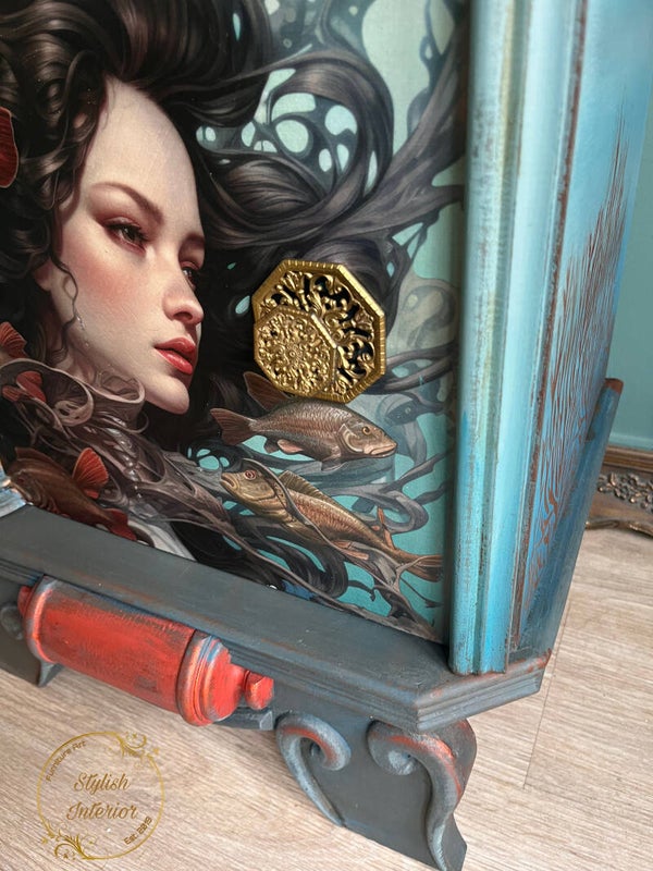 Deze unieke nachtkastjes zijn kleine kunstwerken op zich. Met hun zachte turquoise tint, sierlijke poten en klassieke zuiltjes ademen ze een charmante vintage sfeer. Maar wat ze écht bijzonder maakt zijn de mysterieuze sirenes omringd door vissen en golvende waterlijnen, alsof ze elk moment kan gaan zingen.