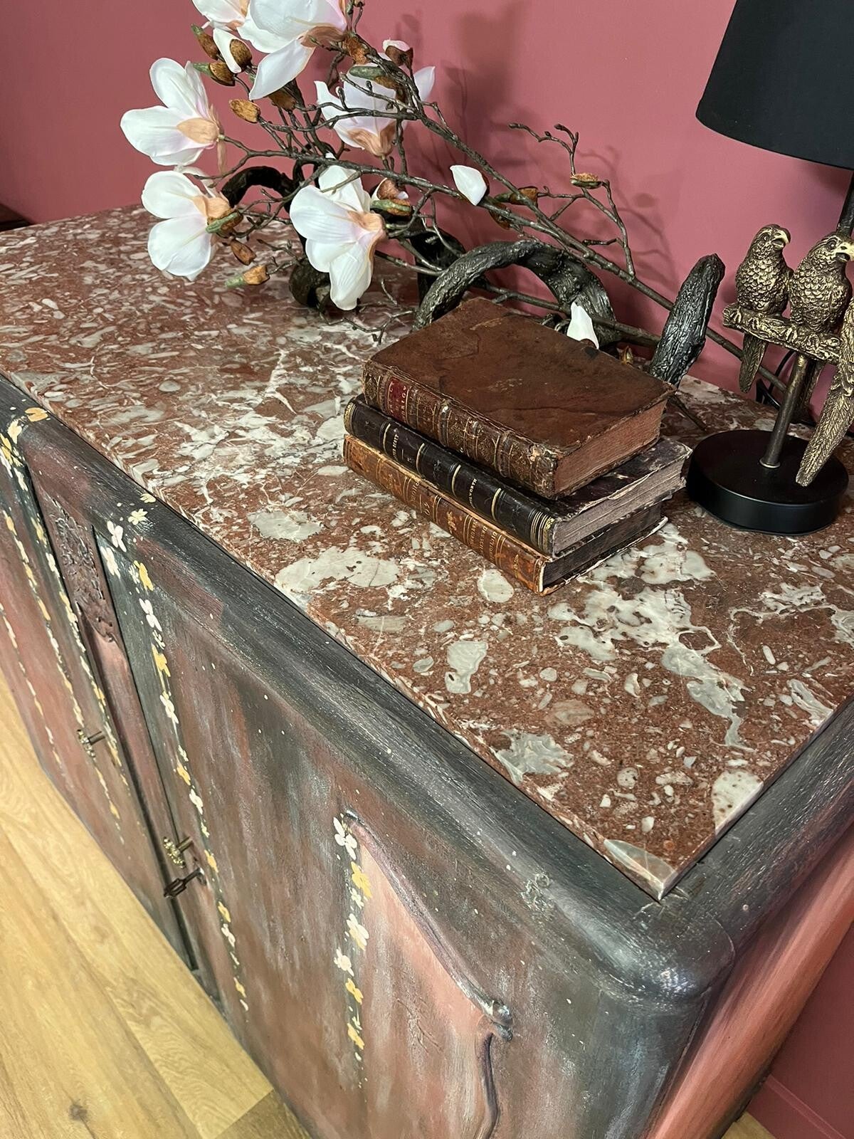 Het blad is van rood geaderd marmer en ze heeft lekker veel opbergruimte met twee lades in de kast.
