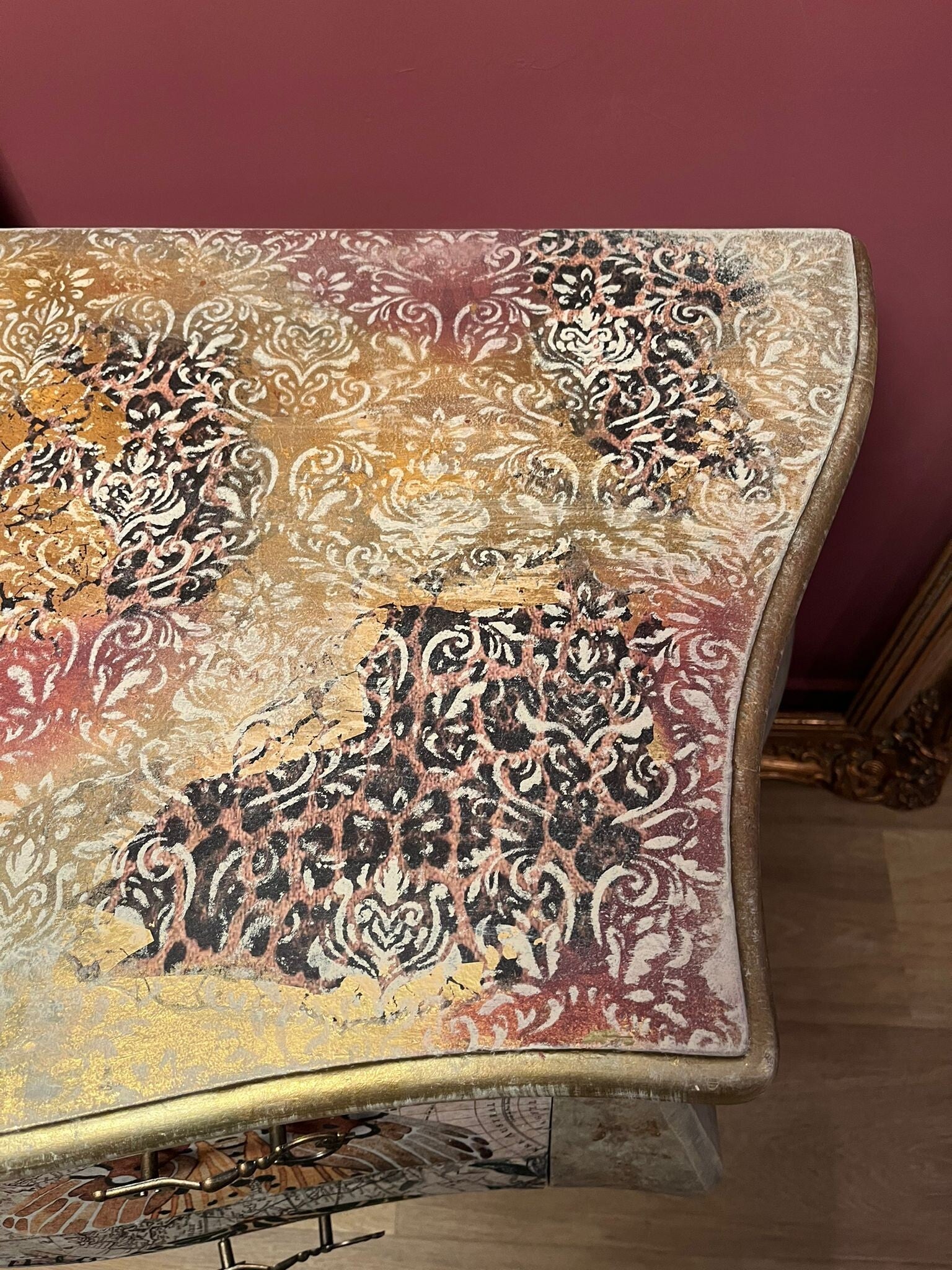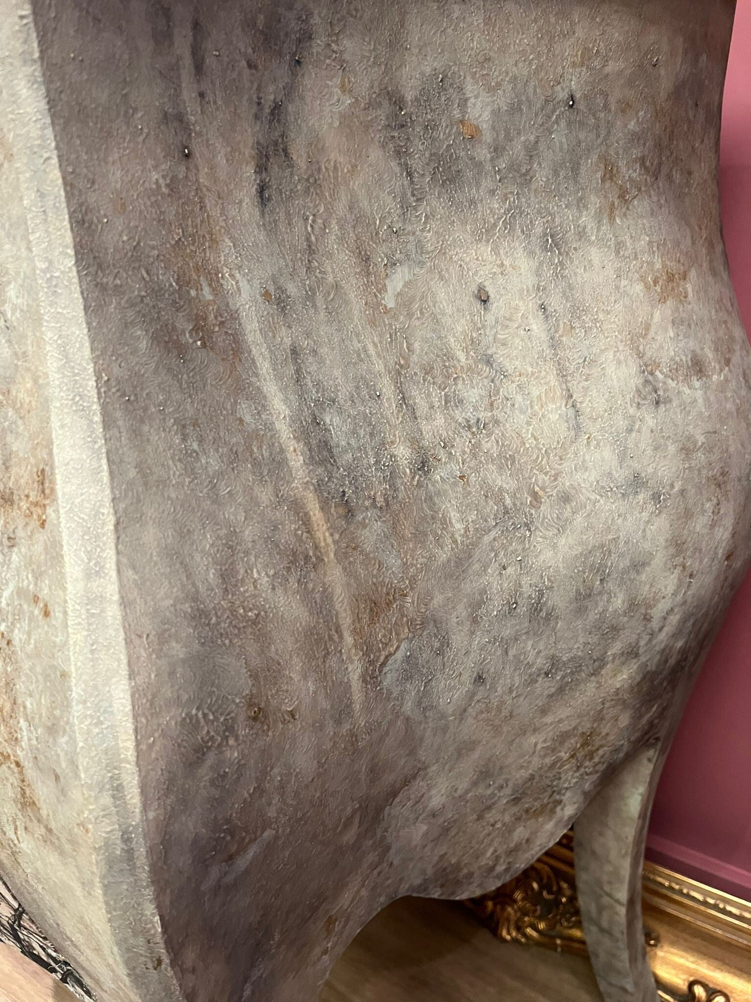 Deze ruime bombe kast heeft een natuursteen uitstraling gekregen door de verschillende technieken die gebruikt zijn.